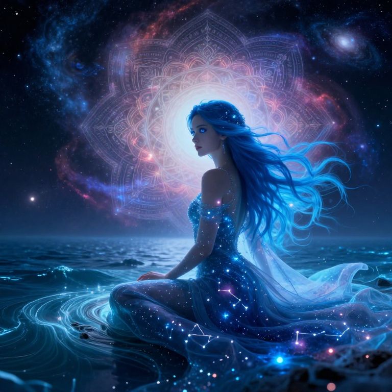 An enigmatic female figure with flowing azure hair and piercing sapphire eyes sits at the edge of a luminescent cosmic ocean in this surreal digital art piece, reminiscent of intricate mandala designs. Her ethereal presence radiates otherworldly energy from a 'worm's-eye view' perspective that reveals glowing constellations woven into her celestial gown. The background features a vibrant tapestry of swirling nebulae and distant galaxies, setting an emotional gradient ranging from wonder to introspection as it invites the audience on a mesmerizing journey beyond reality's confines.