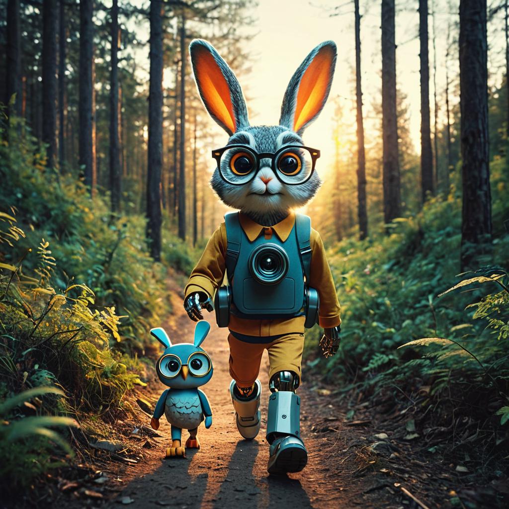 Pastel-colored ink wash illustration of a inventive robot llama merrily trekking a wooded trail at sunset, carrying a hummingbird with tiny spectacles, whimsical cartoon vibe, soft cinematic lighting :: inventive robot llama::0.9 a hummingbird with tiny spectacles::0.9