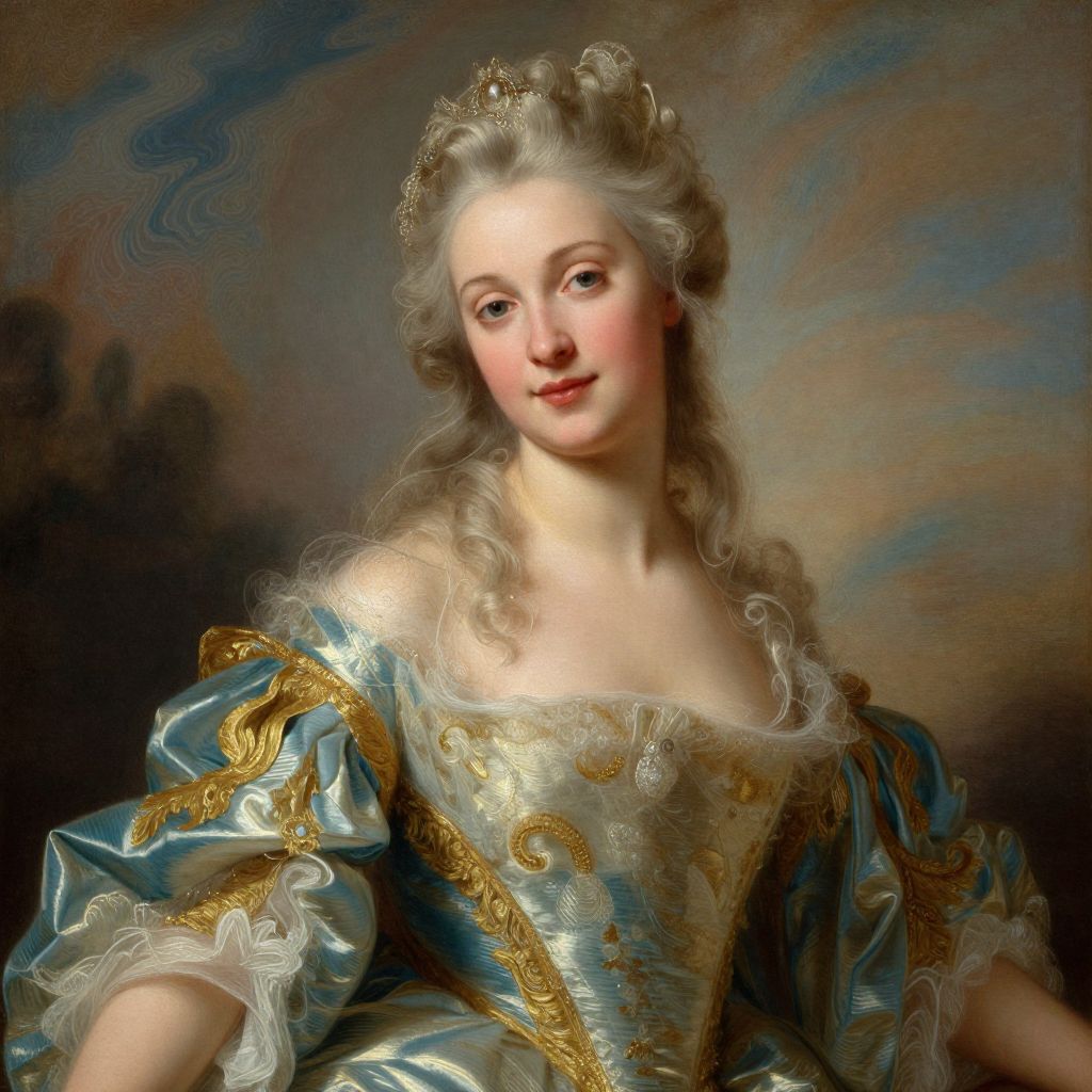 This is a digital painting of a young, Caucasian woman with pale skin and wavy, grayish-blonde hair adorned with a delicate gold headpiece. She has a gentle smile and rosy cheeks. She wears an elegant, off-the-shoulder gown with puffed, blue satin sleeves that have gold embroidery and white lace trim. The bodice of the gown is gold with intricate patterns, and the background is a gradient of dark to light blue and brown, creating a soft, muted atmosphere. The painting style is realistic with a classical, 18th-century portrait feel.