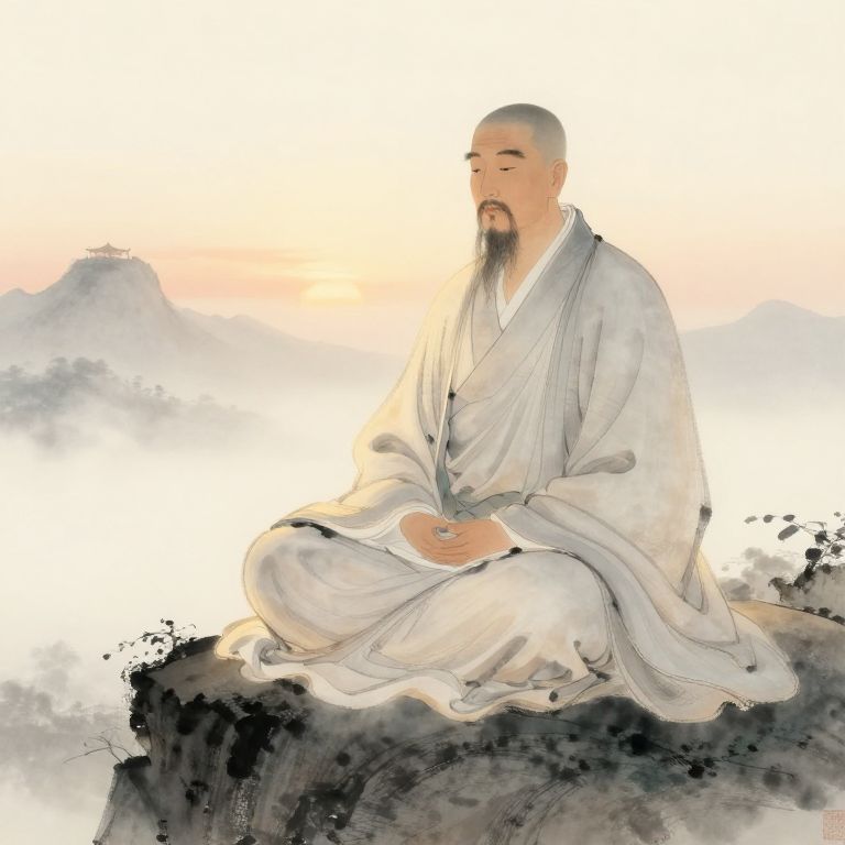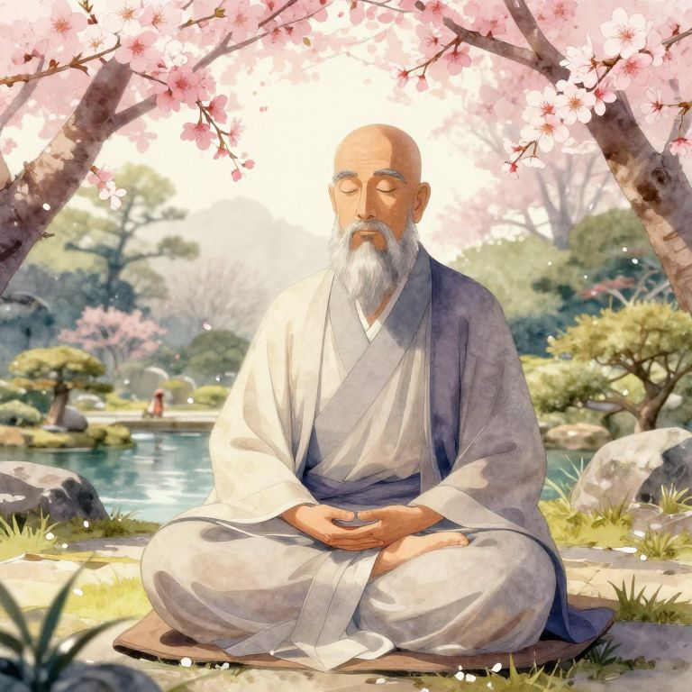 Stoic beard sage meditating in a serene Japanese garden, soft diffused light, cherry blossoms gently falling, calm expression, harmonious composition, watercolor effect