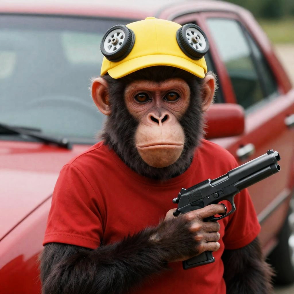 Photograph of an anthropomorphic monkey with a serious expression, wearing a yellow cap with bicycle wheels and a red shirt. The monkey holds a black pistol in its right hand. Background includes a red car with a side mirror.