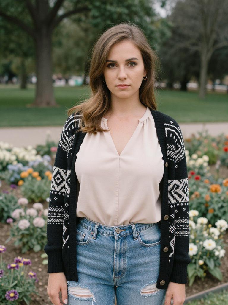 A willowy woman in a kodacolor analog film style, wearing a black cardigan with geometric patterns, a blush blouse, and distressed jeans, stands in a flower garden in a serene park. Sexy. Pretty face and beаutiful eyes. Big breasts