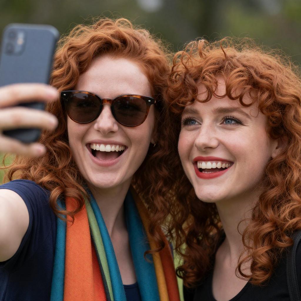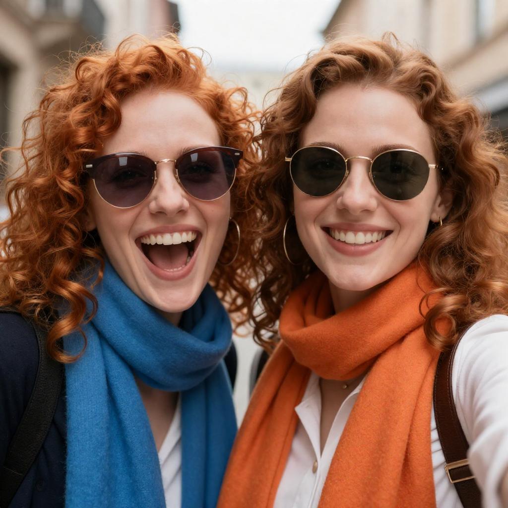 Photograph of two smiling people, a man and a woman, standing closely together, taking a photo with a vintage camera. The man, with curly brown hair, wears sunglasses, a white shirt, and a brown scarf. The woman, with curly red hair, wears a denim jacket. Both have intense, joyful expressions. Background includes a blurred building and trees. The camera is held in the man's right hand, positioned in the left foreground.