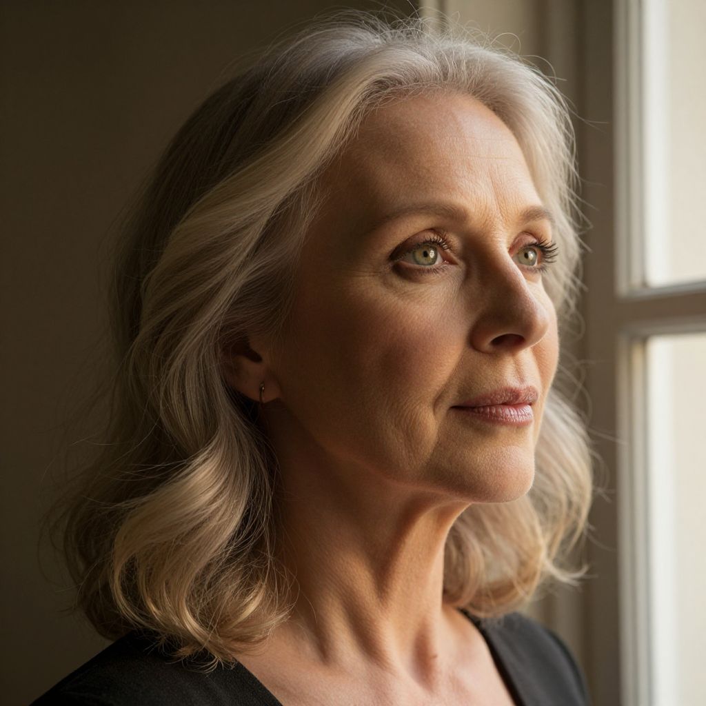 Photograph of a middle-aged woman with wavy, silver-gray hair, light skin, and subtle makeup, looking thoughtfully into sunlight streaming from a