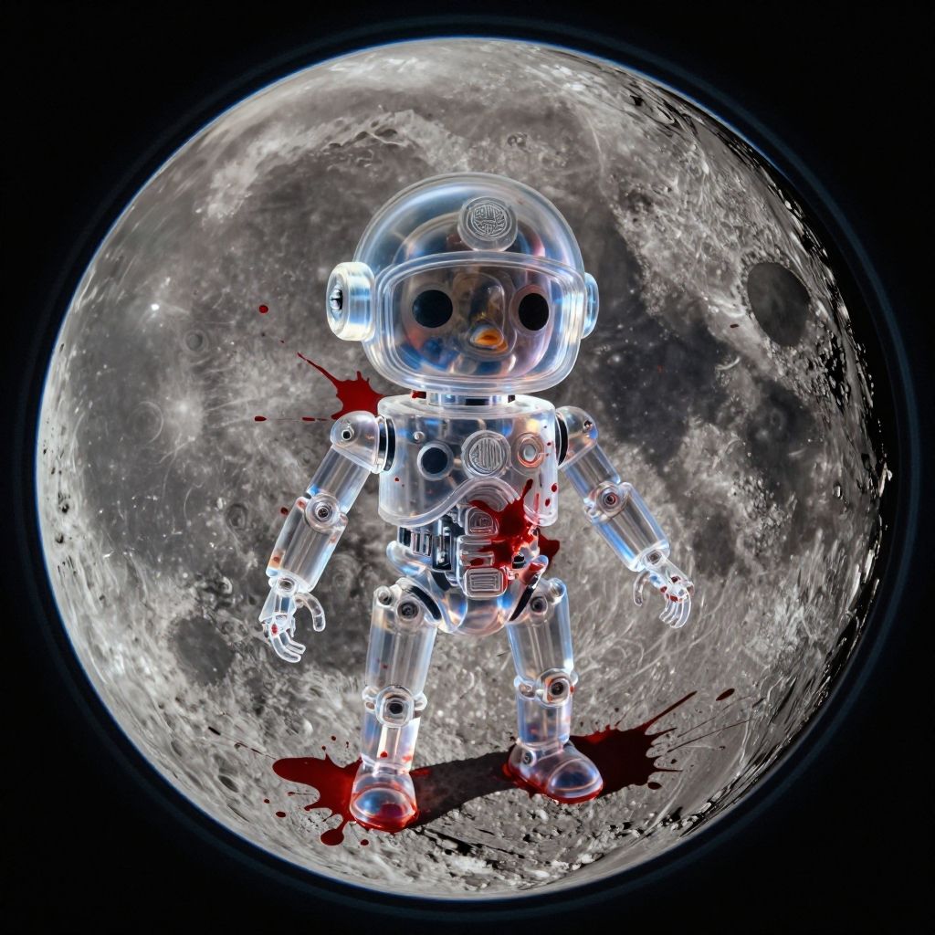 Fisheye lens (fisheye view) photograph, ((Transparent Murder-Mech on the moon)), militaristic echo image, blood splatters, emblem, echo image, sidelit, masterpiece from a different dimension, film grain, noise offset, Getty Images quality photograph, cute and endearing photograph contrasted by violent mania, double exposure, multiple-exposure photograph, UHD, very slow shutter speed to capture motion, experimental coloured lighting, experimental angles, strong fisheye-lens/ intense fisheye-view photograph, intricately detailed, very detailed background, realisticvision-negative-embedding, epiCRealism