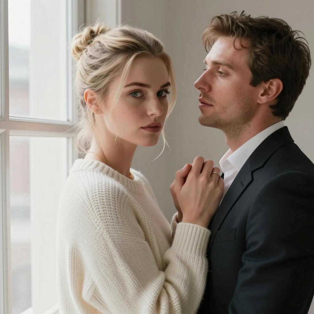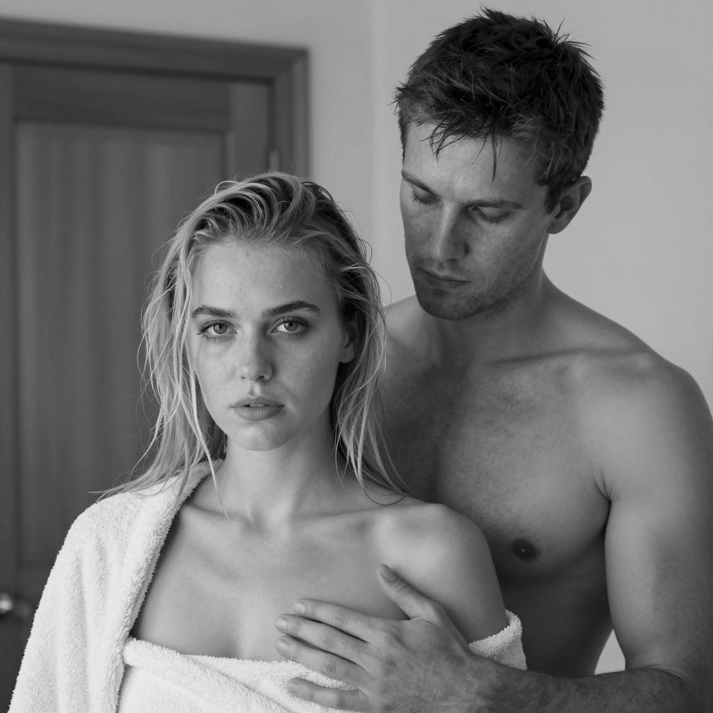 Photograph of a close-up, intimate moment between a man and a woman. The woman has light skin, brown hair, and green eyes, with a neutral expression. The man, also light-skinned with blonde hair, is shirtless, his face close to hers, eyes focused. They are touching foreheads, noses almost touching. The background is dark, emphasizing their faces. Both have slight facial hair and natural skin ures.