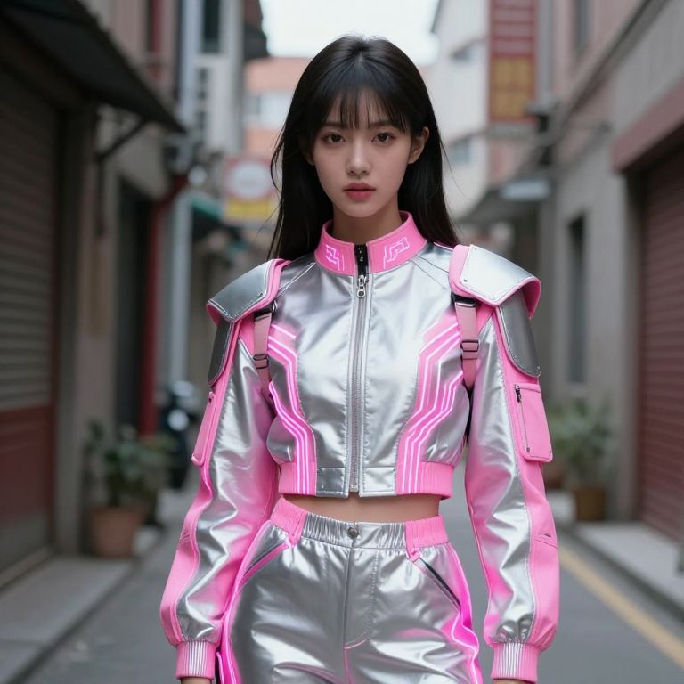 A stylish girl with fair skin, high cheekbones, and a calm expression is posed in a vintage cyberpunk alley, dressed in a futuristic aesthetic outfit featuring neon-pink and silver elements, glowing circuit patterns on the seams, and a structured jacket with shoulder pads, reflecting a cyber-feminine aesthetic.