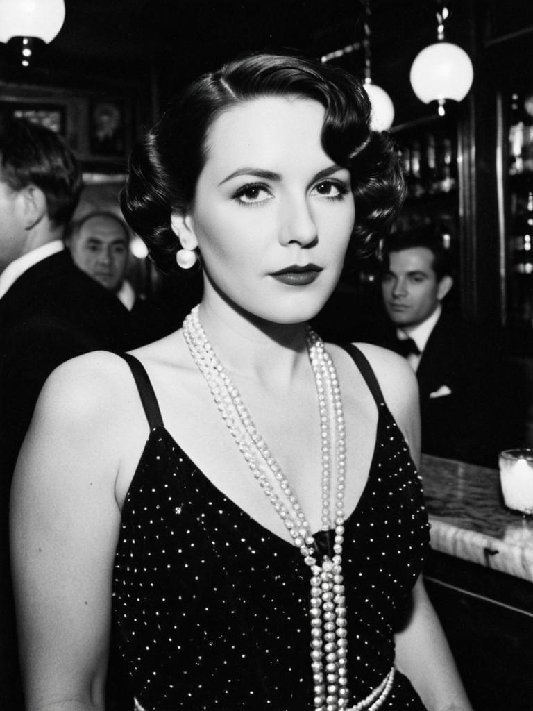 Woman in Speakeasy Costume, waist-up editorial portrait with pearls