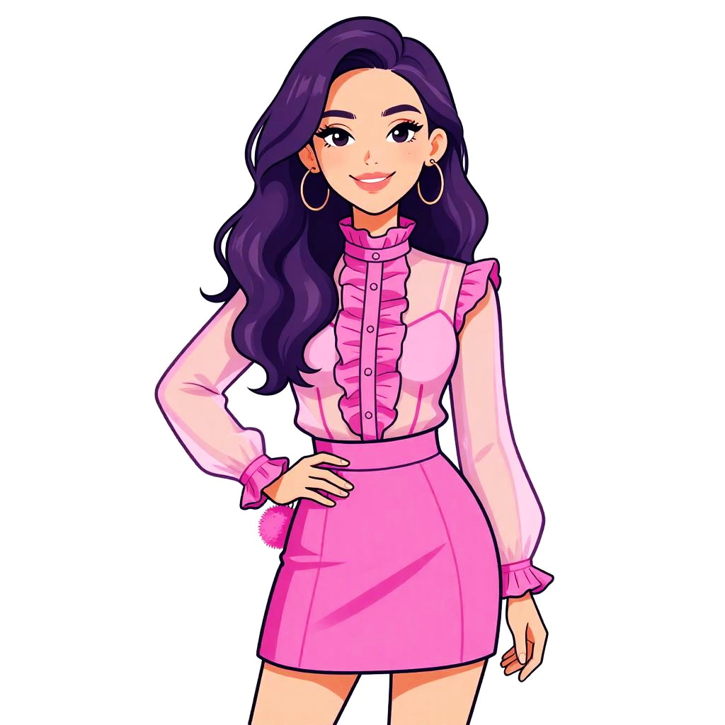 Digital illustration of a stylish woman with fair skin, black wavy hair, purple beret, red sleeveless dress, and hoop earrings.