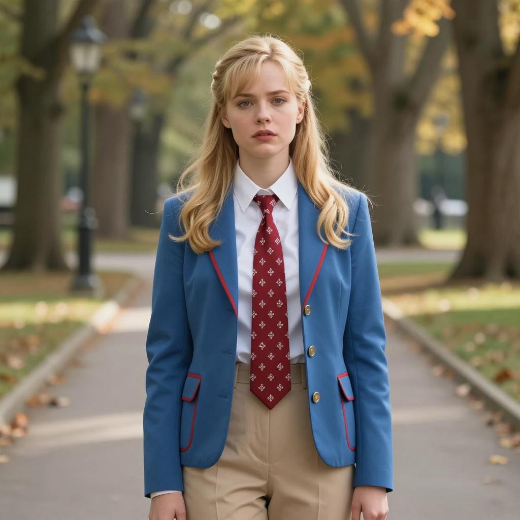 Blue dress alice wonderland, photorealistic, young woman, blue Alice in Wonderland dress, puffed sleeves, white collar, blue ribbon, blue bow in hair, long wavy blonde hair, fair skin, blue eyes, serious expression, medieval castle background, blurred garden with colorful flowers, other women in similar dresses in background, soft lighting, detailed ures, digital painting, detailed fabric folds, realistic shadows