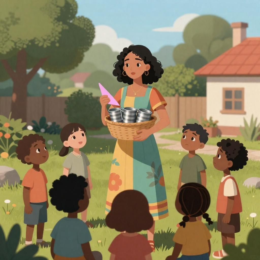 Digital illustration of a smiling, curly-haired Latina woman with large glasses, wearing a white blouse with black lace trim and a colorful skirt, standing outdoors in front of a red-tiled house with green shutters. She is surrounded by children with dark hair, facing her. Bright blue sky and green trees in the background.