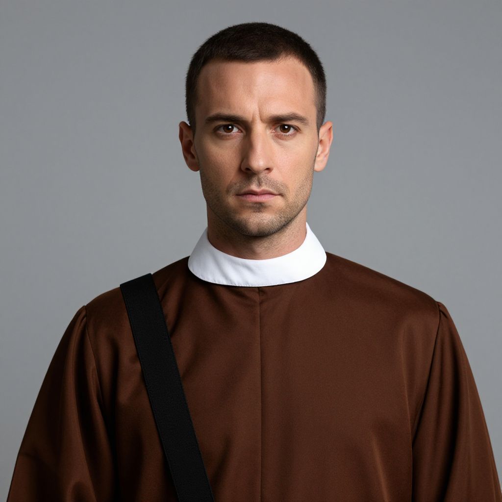 Photograph of a serious-looking man with short, dark hair and light skin, standing against a plain, light gray background. He has a clean-shaven face with a slight stubble and dark brown eyes. He is wearing a brown, long-sleeved clerical garment with a white collar and a black strap crossing his right shoulder. The lighting is even, highlighting his facial features and the texture of his clothing. His expression is neutral, and he is centered in the frame. The image has a realistic, studio-portrait style.