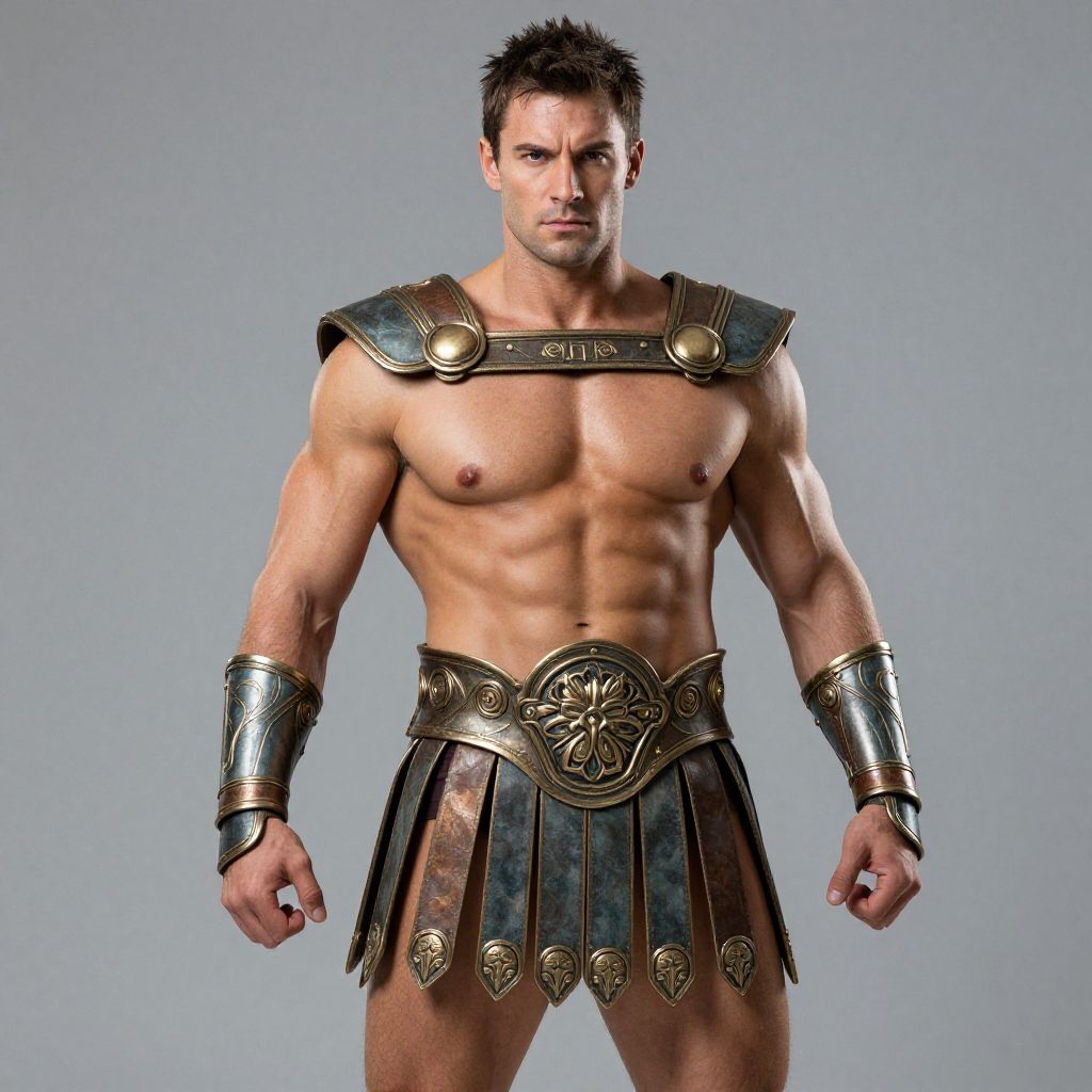 A powerful man dressed in a Hephaestus god costume stands confidently, showcasing a muscular physique and detailed armor elements. The costume features classical Greek-inspired design with intricate metalwork on the belt and gauntlets, embodying the mythological blacksmith god's strength and craftsmanship.