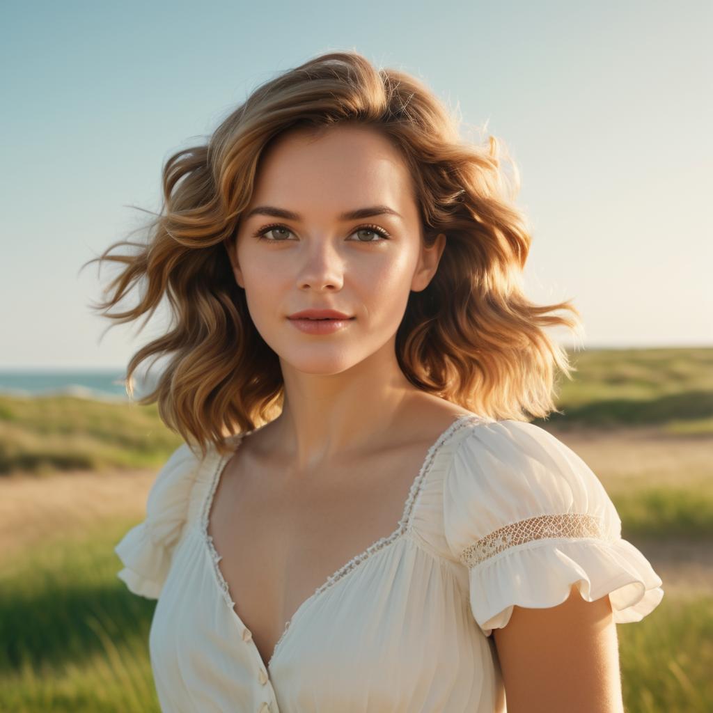 Female portrait of Emma Watson, with bright eyes, a charming smile, and soft curls. She stands with hair styled in loose waves, looking at the horizon under a bright summer sky with natural lighting. Captured in 8K with 35mm for cinematic color grading and soft, romantic tones.