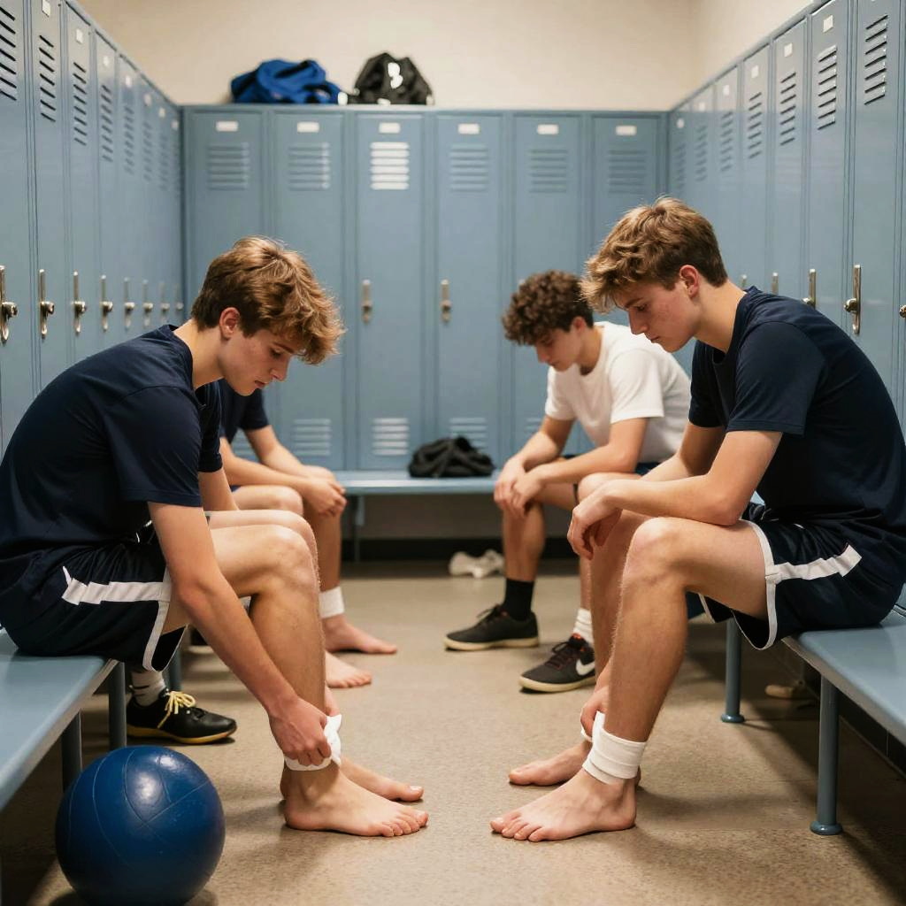 Teen boy locker room in a high school gym, boys wrapping ankles and sharing motivational moments, detailed locker textures, soft focus background with sports equipment