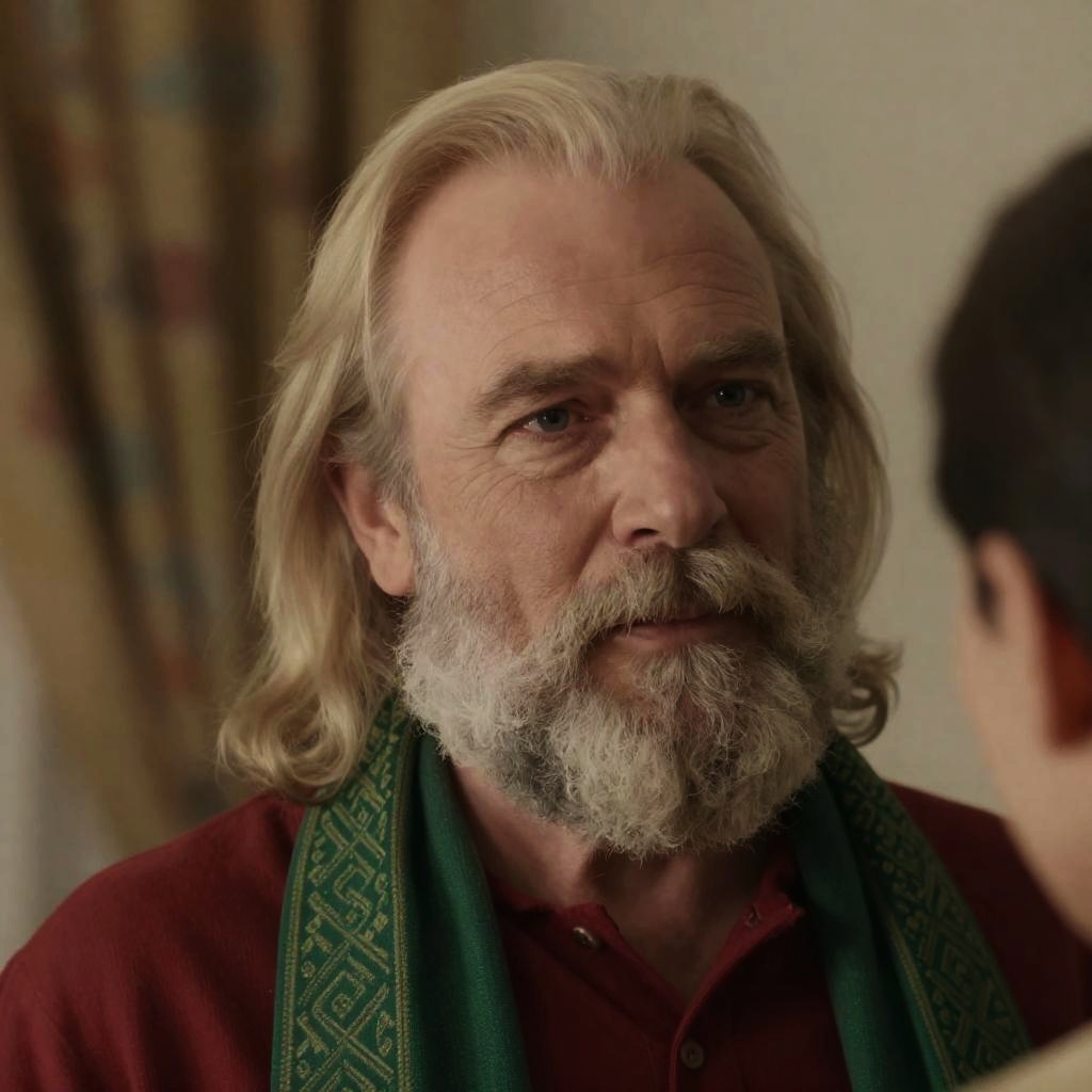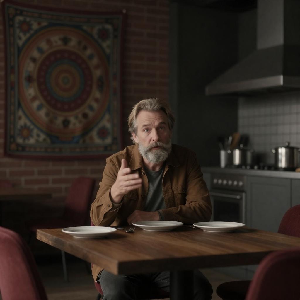Middle-aged man with gray beard and blonde hair, wearing brown jacket and gray shirt, gestures with right hand, sitting at dark wooden table. Dark, dimly lit room with brick wall, large colorful tapestry, and industrial kitchen background. Two red-cushioned chairs. Plates and utensils on table.