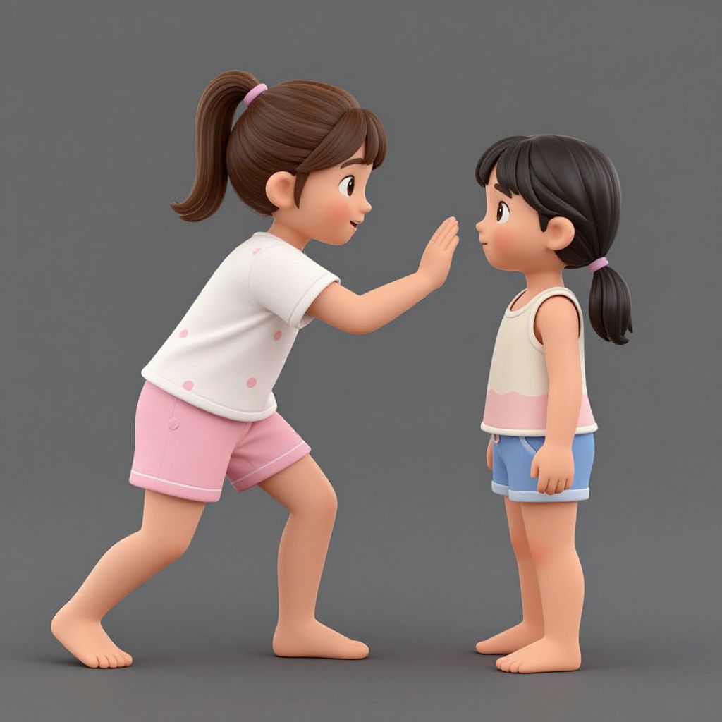 3D rendered cartoon-style image of two young girls interacting. One girl with brown hair tied in a ponytail, wearing white short-sleeve pajamas with pink shorts, is playfully reaching out to another girl with black hair in a ponytail, wearing a sleeveless top and blue shorts. Both girls are barefoot and set against a plain grey background.