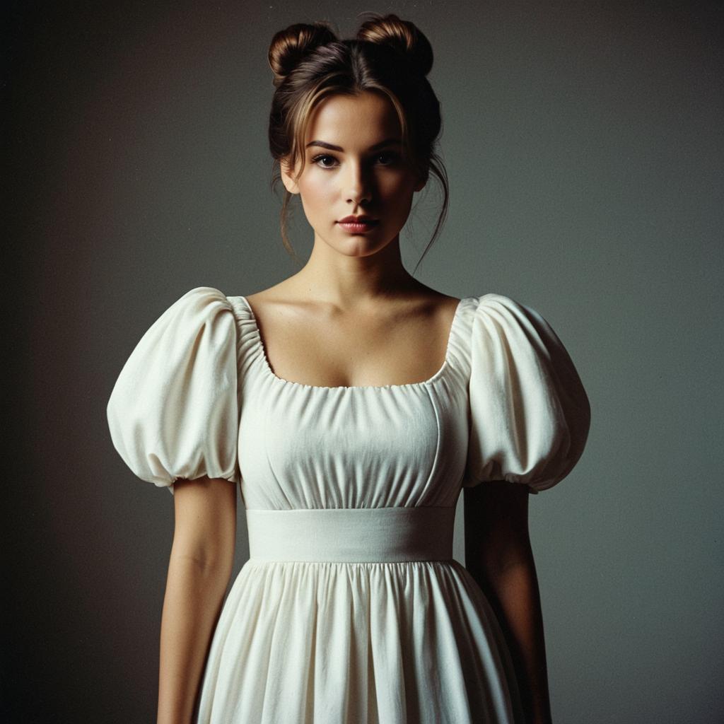 Gothic circus costume ,1girl, solo, looking at viewer, double bun, hair bun, mole, brown hair, mole under eye, closed mouth, upper body, blurry background, dress, blurry, black dress, cross-laced clothes