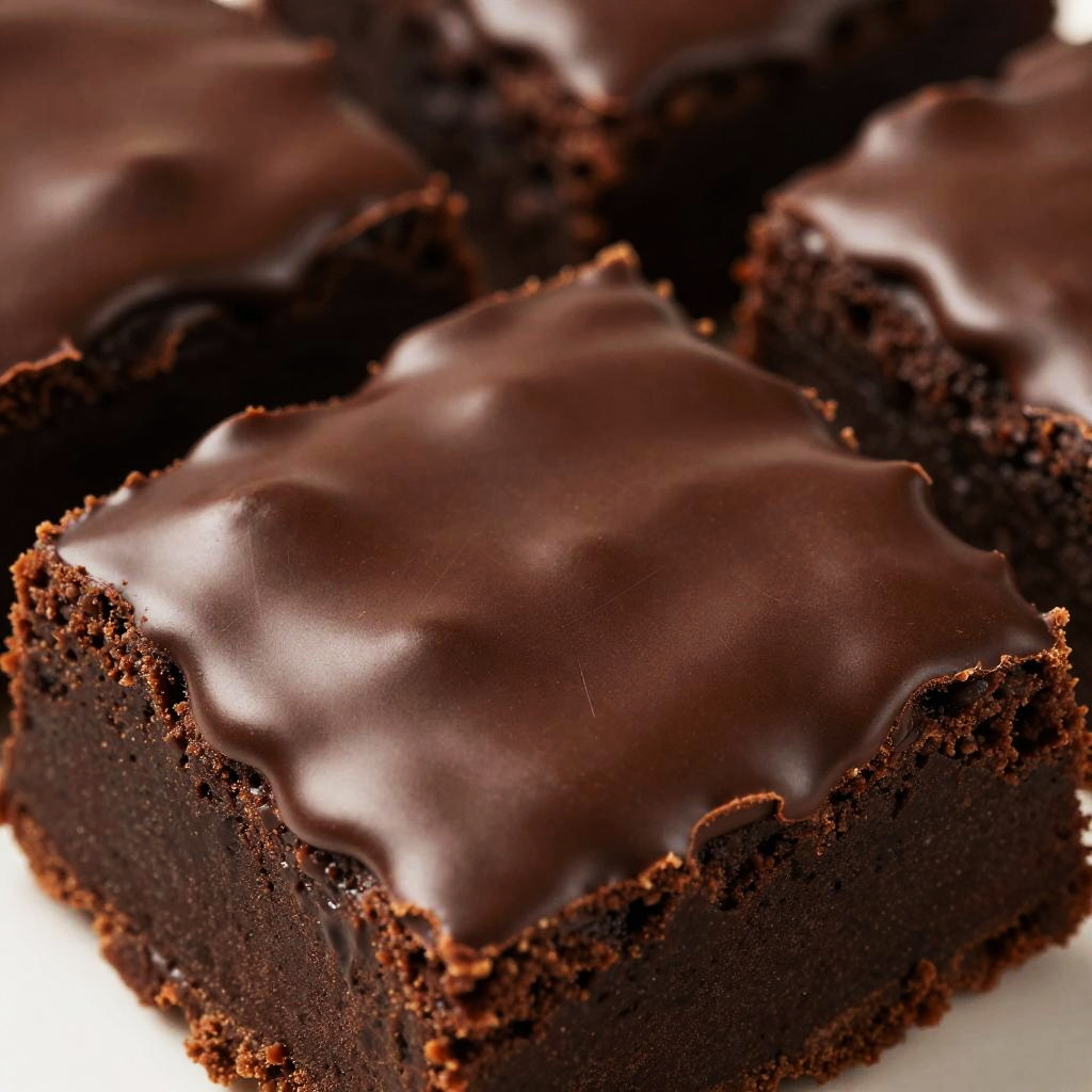 Photograph of rich, dark chocolate squares, each topped with a glossy, smooth layer of chocolate icing. The squares have a dense, moist texture with a slightly crumbly, brown edges. The background is blurred, keeping the focus on the chocolate desserts. The glossy icing reflects light, highlighting its smooth surface. The close-up shot emphasizes the contrast between the dark chocolate base and the shiny, brown icing on top. The image is vivid, with rich, deep brown and dark black tones dominating the composition.