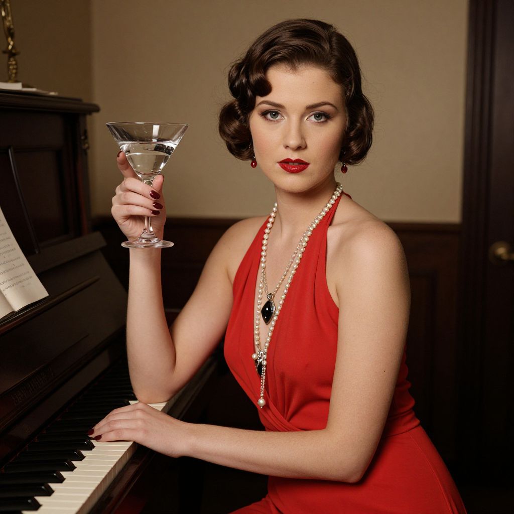 Photograph of a fair-skinned woman with short, wavy dark brown hair, wearing a red halter-neck dress and pearl necklace with a black pendant. She has bright red lipstick and is holding a martini glass with clear liquid in her right hand, resting it on her shoulder. She sits at a dark wooden piano, with sheet music visible on the left. The background is a dimly lit room with beige walls and a dark door on the right. Her expression is slightly serious, with a hint of allure. The image has a vintage, Hollywood glamour style.