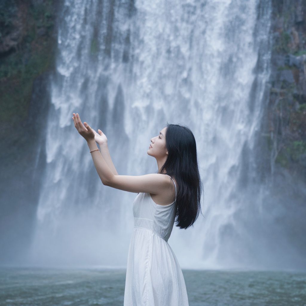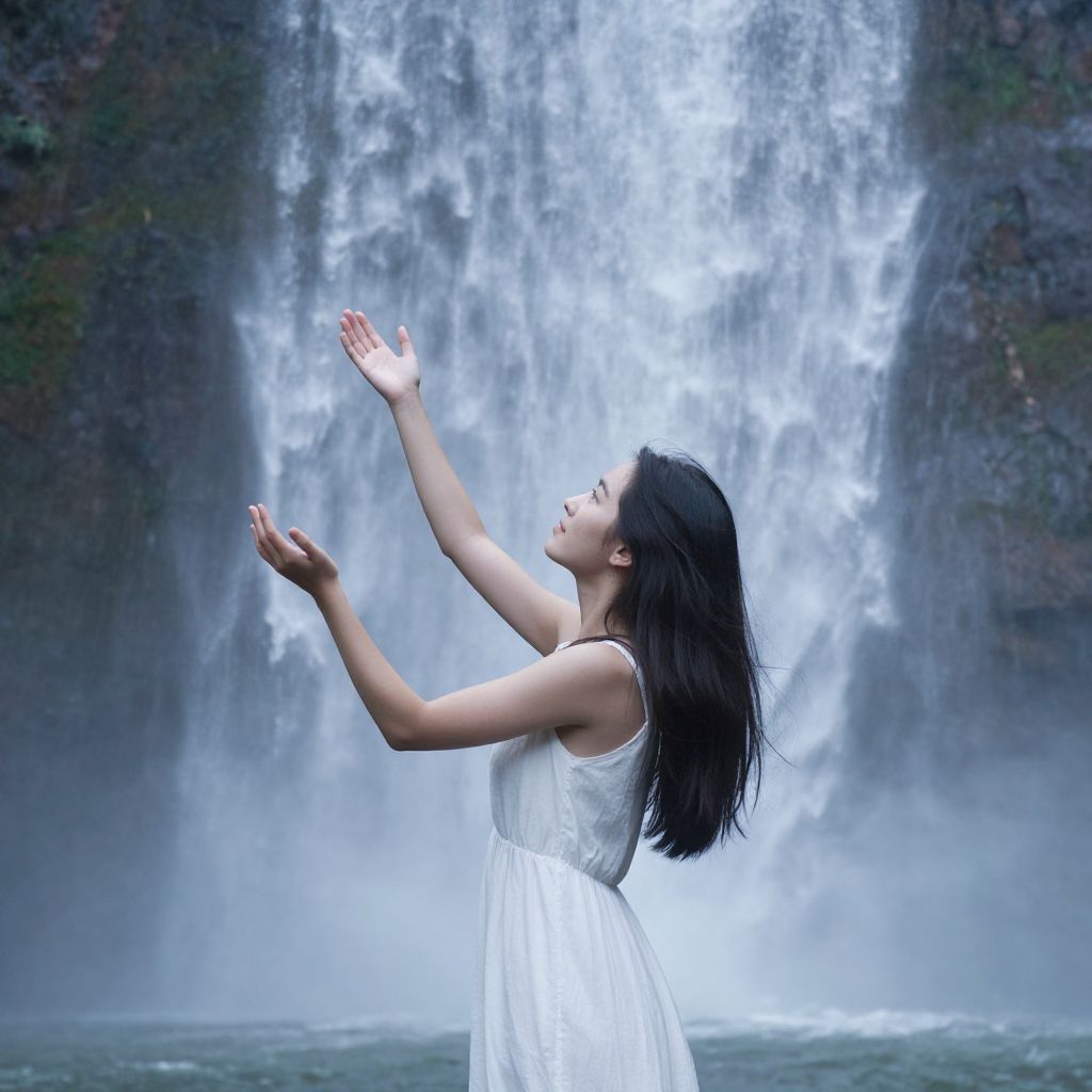 Photograph of an Asian woman with long black hair in a white dress, arms raised, standing before a towering waterfall.