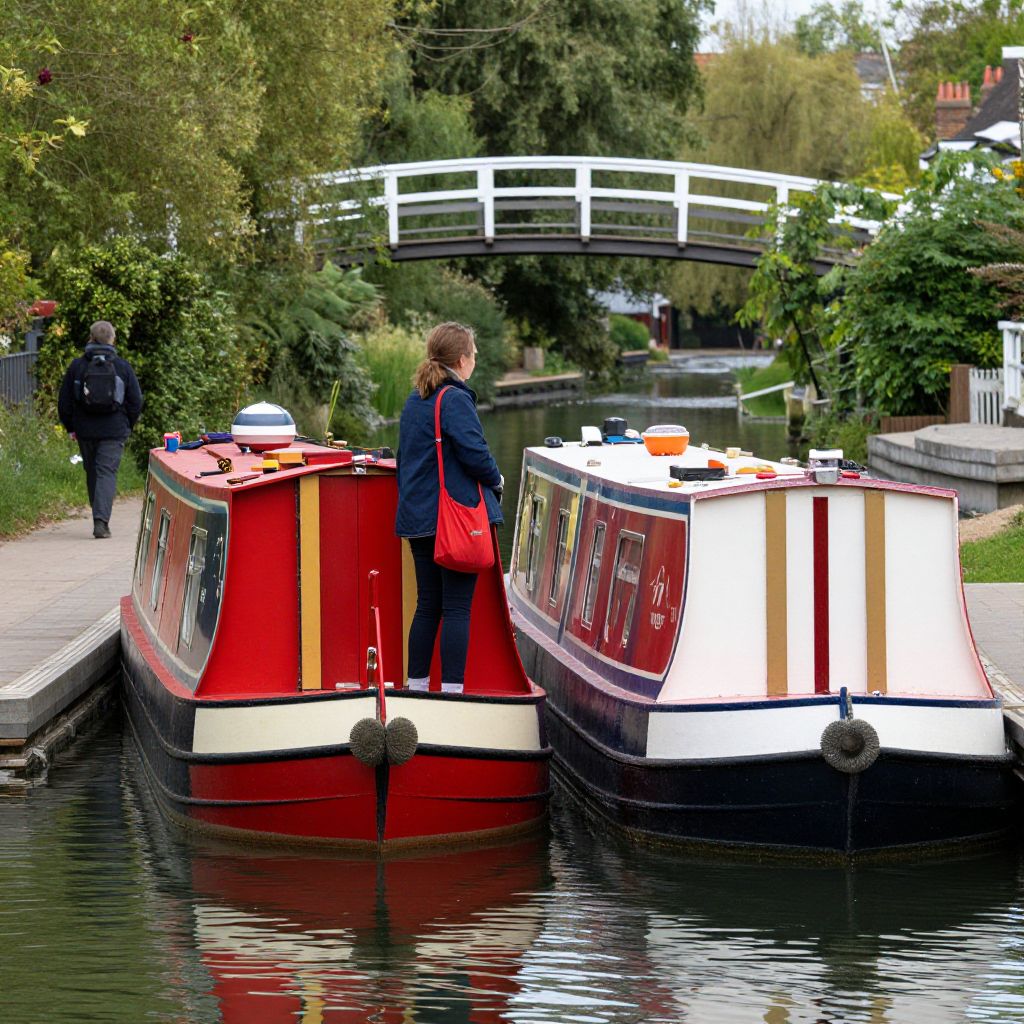Photograph of two narrowboats moored side by side on a canal. The boat on the left is red with white accents, while the one on the right is white with red and yellow stripes. A woman with brown hair in a ponytail, wearing a navy jacket and red shoulder bag, stands on the left boat. In the background, a person in a black jacket walks on the left path, and a white arched bridge spans the canal. Lush green trees and a white fence line the right side of the canal. The scene is bright with natural daylight.