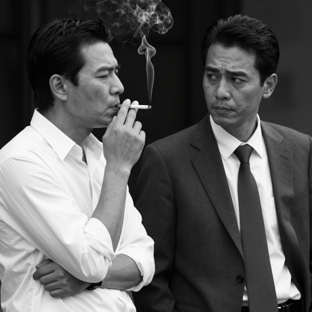 Photograph of a man with dark hair, black glasses, and large black headphones, holding a cigarette in his right hand. He has a serious expression. Blurred background with indistinct people and objects. Man wears a dark shirt.