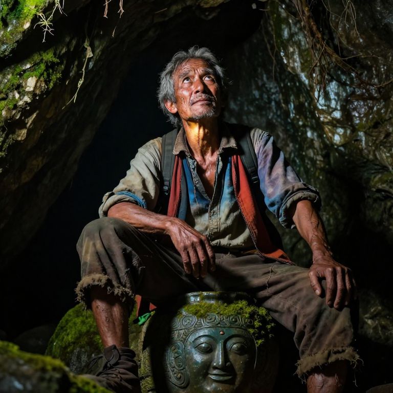 A striking portrait photograph captures an adventurer with shabby-chic attire, their face illuminated by a mysterious light emanating from within a hidden underground cave. The ethereal glow casts dramatic shadows across a rugged visage, accentuating years of hardship and wisdom etched upon their skin. From an unusual low-angle perspective, the viewer is invited to look up at the adventurer, seated atop a massive, ancient artifact that blends seamlessly with the moss-covered stone surroundings. This composition evokes a sense of reverence for the subject's resilience and a curiosity about the untold stories hidden within their eyes—a fusion of naturalism and cinematic lighting that emphasizes every detail, from the fine lines and tiny wrinkles to the vibrant hues of their well-worn attire.