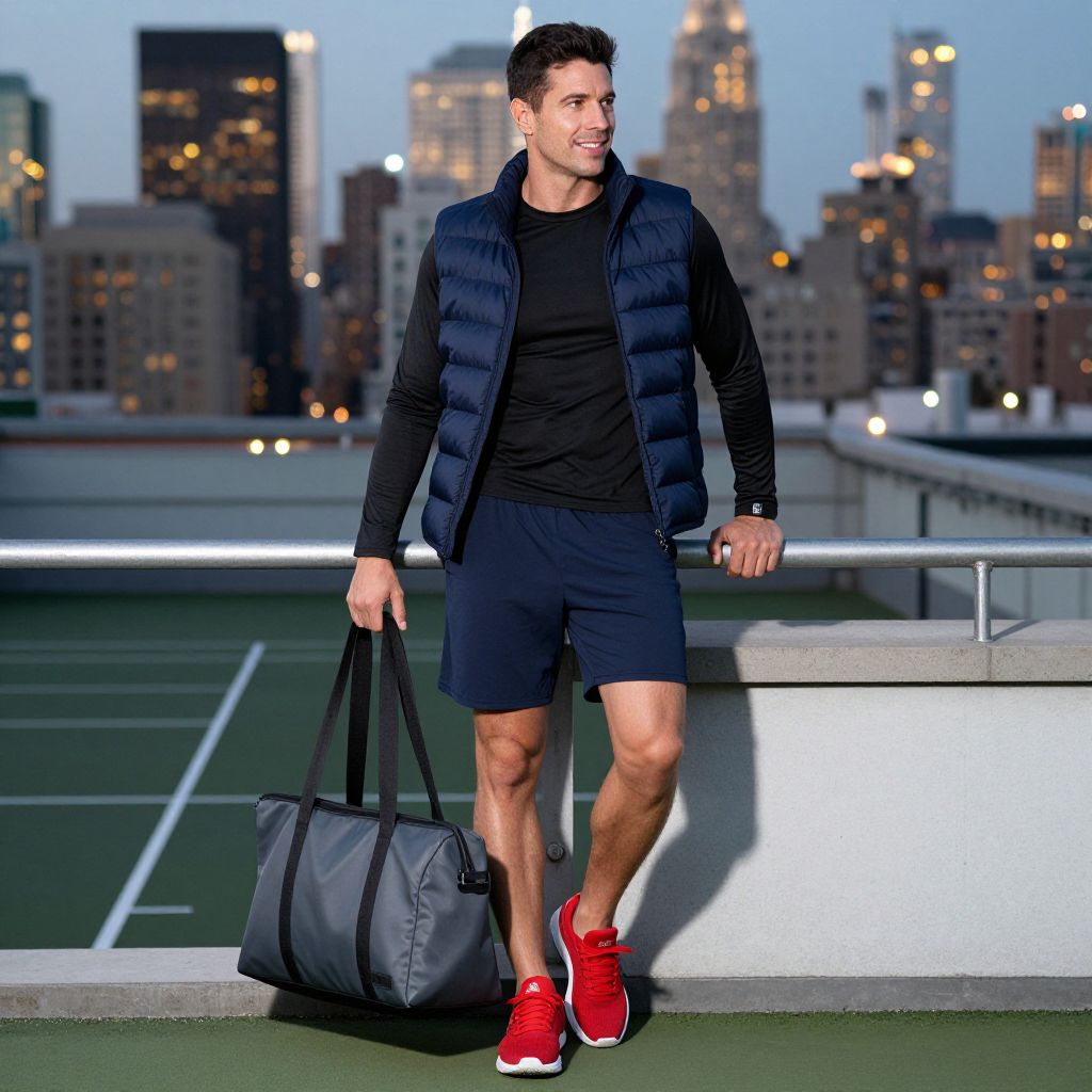 A man, athletic shorts in navy, fitted black long-sleeve tee, dark blue puffer vest, red cushioned trainers, charcoal sleek gym tote, urban rooftop courts, skyline view, bright city lights at dusk, Diego Fazio style, leaning against a railing, confident smile, looking off into the distance.Man has masculine face and piercing eyes