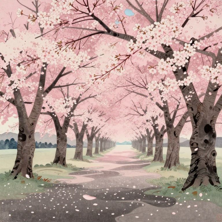 Digital artwork of a serene cherry blossom tree-lined path, with pink flowers, falling petals, and a bright, sunlit horizon.