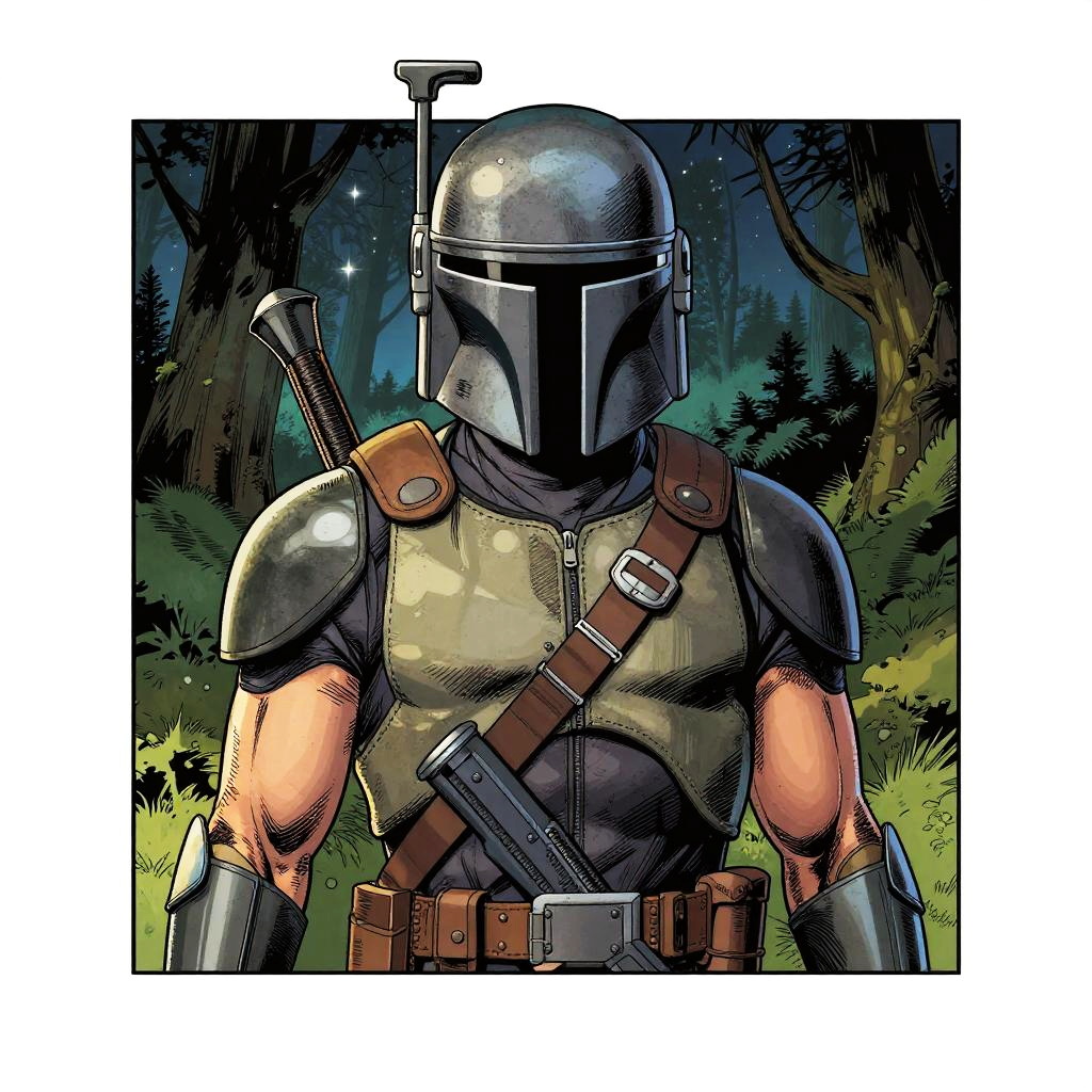 Comic artwork of space bounty hunter, portrait, smiling, happy, forest background, starlit dark sky, crosshatching, 2D, Sharp, Detailed, HD, HDR, High Quality, High Resolution, Masterpiece