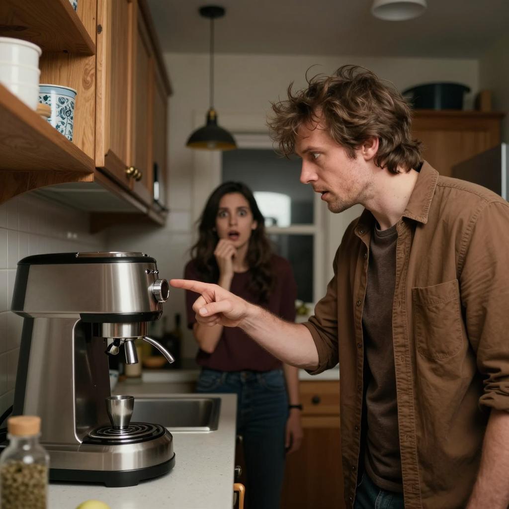 Man with disheveled hair in brown shirt points a large kitchen appliance at a woman in the background. Kitchen setting with wooden cabinets, shelves, and hanging lights. Woman looks startled. Dark, cluttered atmosphere. Two people. Man's intense expression.
