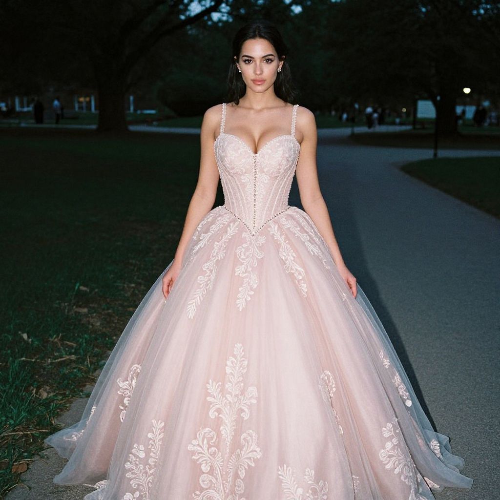 A woman, romantic prom style, blush pink ball gown with embroidered lace bodice, sweetheart neckline, thin spaghetti straps, cinched waist with decorative beading, full-length voluminous skirt with layered tulle and ornate appliqués, evening stroll through a lit-up park. Shoulder level shot, disposable camera, film noir lighting Sexy. Pretty face and beаutiful eyes. Big breasts