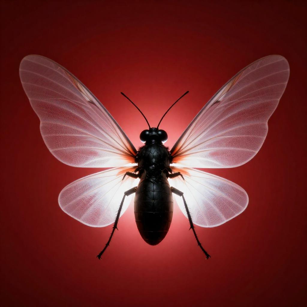 Photograph of a black, insect-like creature with large, translucent wings spread wide, illuminated by bright white light from below. The background is a vivid red, creating a stark contrast. The creature's wings have a delicate, mesh-like ure. The image has a dramatic, high-contrast effect.