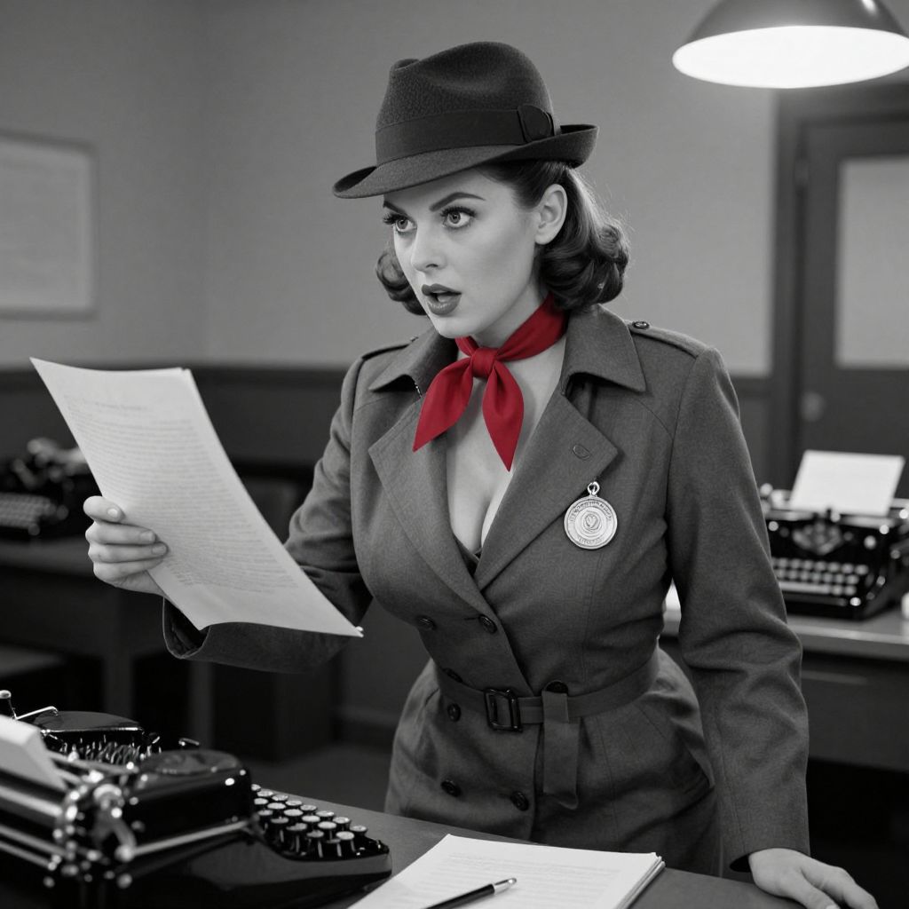 A black-and-white photograph of a vintage-style woman with fair skin and dark hair, wearing a black fedora, dark gray military-style jacket with a badge, and a red neckerchief. She has large, round eyes and full lips, and is holding a paper with a surprised expression. She sits at a desk with an old-fashioned typewriter and another paper. The background includes a blurred wall and a door. The image has a high-contrast, dramatic style with selective color accents, emphasizing the red neckerchief and her expressive face.
