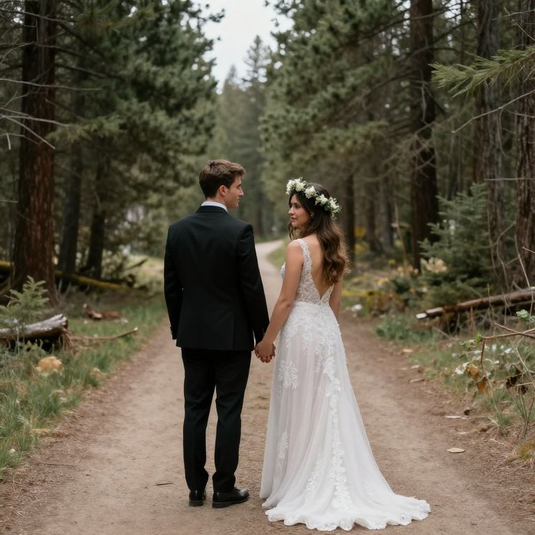 Photograph of a couple standing on a dirt path in a dense forest. The bride, with long brown hair and wearing a white, sleeveless lace wedding dress with a backless design, has a floral crown. The groom, with short brown hair, wears a black suit with a white shirt. They hold hands, looking at each other. Tall pine trees surround the path, which is lined with grass and small plants. The lighting is natural, with a soft, overcast sky. The overall mood is romantic and serene.