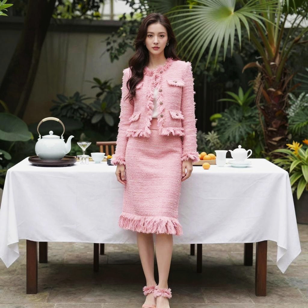 A willowy woman in a contemporary romantic style, wearing a textured pink tweed jacket with frayed edges, a coordinating skirt with a fringed hem, and frilled tweed sandals, stands elegantly at a Refined Tea Service in a Botanical Garden. Sexy. Pretty face and beutiful eyes