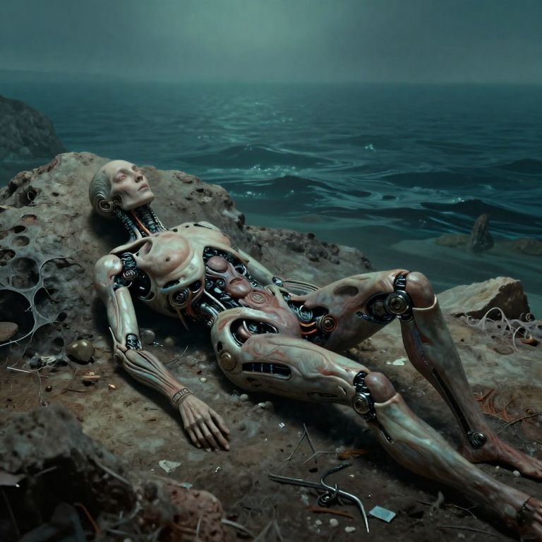 Imagine a captivating digital artwork that intertwines the unsettling biomechanics reminiscent of H.R. Giger's otherworldly visions with Salvador Dali's dreamlike surrealism. This haunting scene depicts an enigmatic figure resting in a liminal space between desolate, rocky terrain and an immeasurable abyssal sea. The figure's form is intricately fused with organic machinery that seamlessly merges with its flesh, as if it has become one with its own creation. The chilling yet mesmerizing atmosphere evokes a spectrum of emotions from awe to fear, as the delicate balance between reality and nightmarish fantasy hangs in the air.