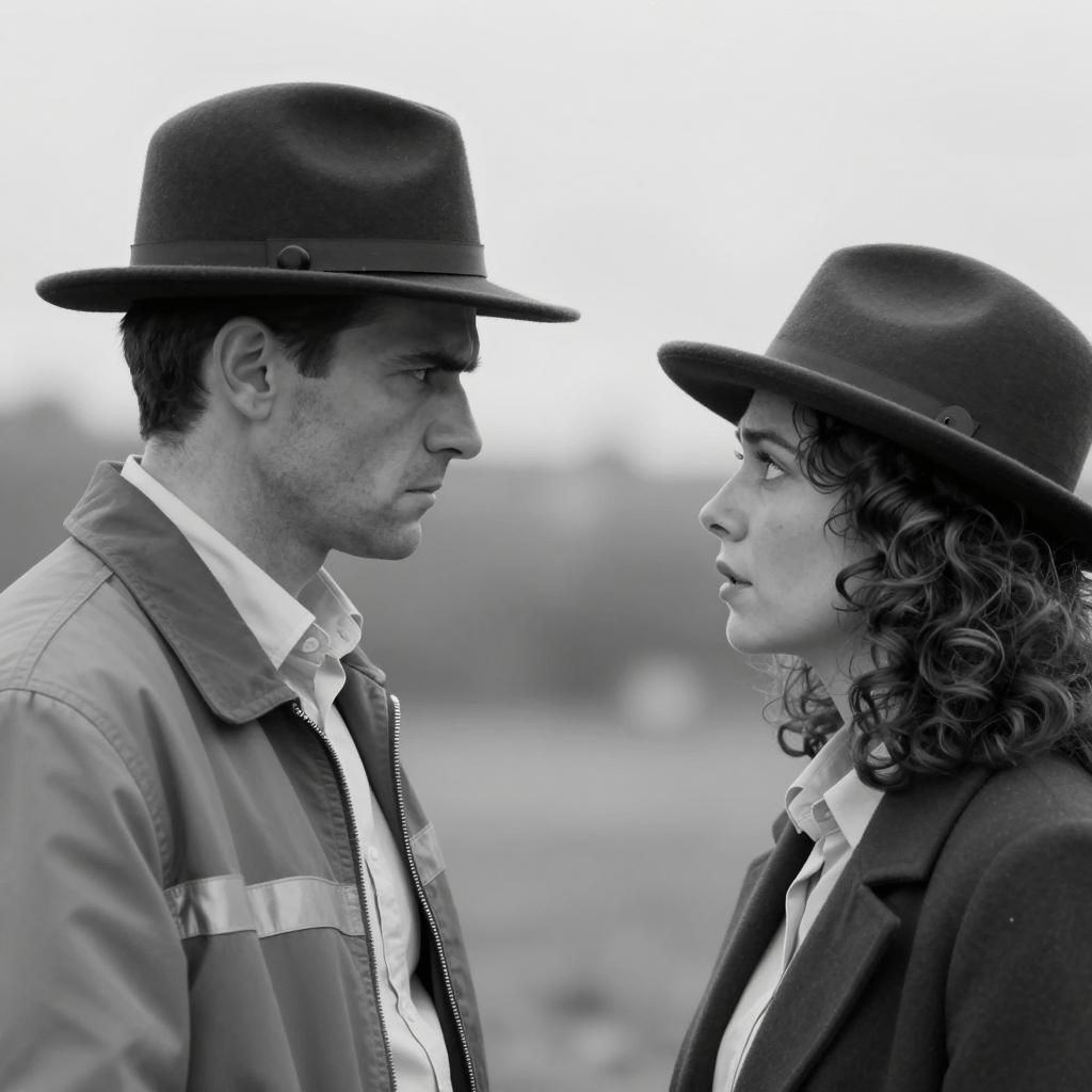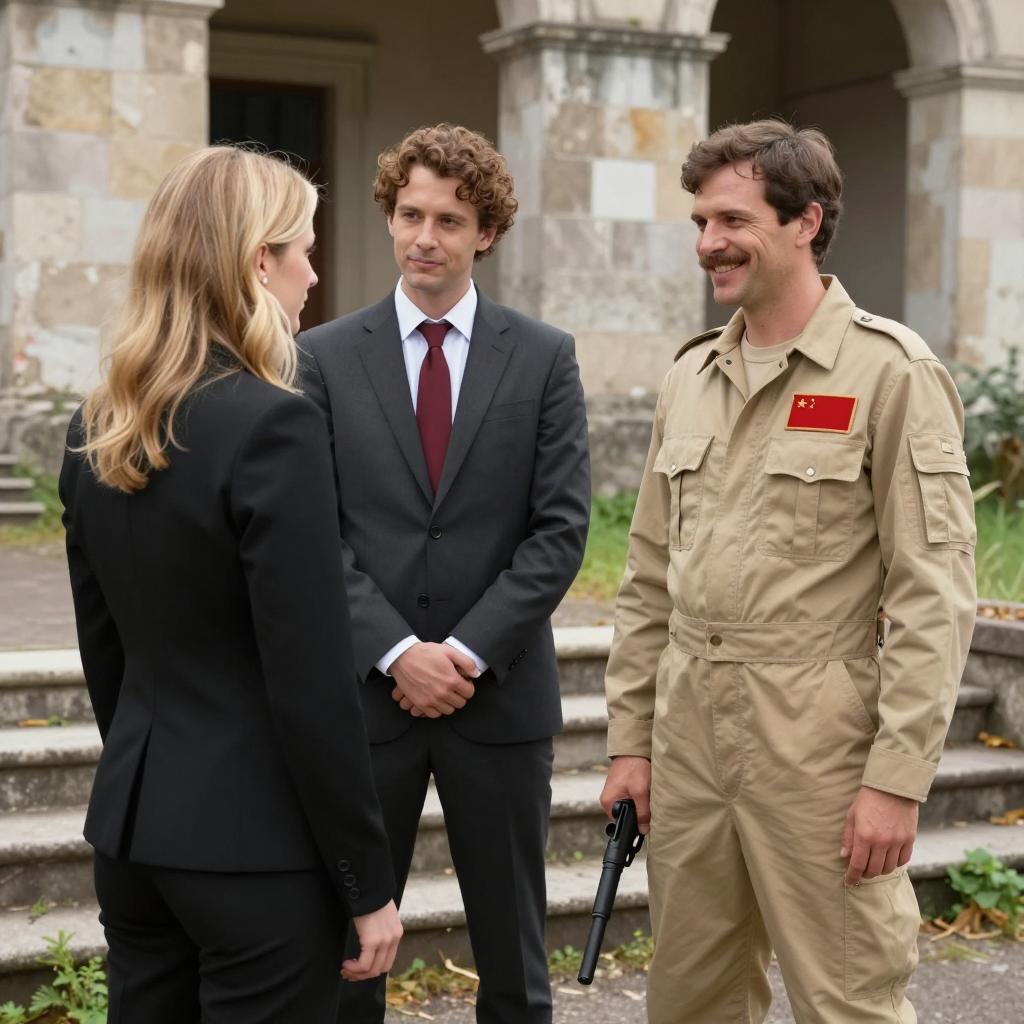 Two men in a vintage aircraft cockpit. The man on the left has dark curly hair, a brown sweater, and a tan vest. The man on the right has a mustache, wears a black cap and leather jacket, and is operating the aircraft controls. Red-tipped aircraft nose in the background. Bright daylight.