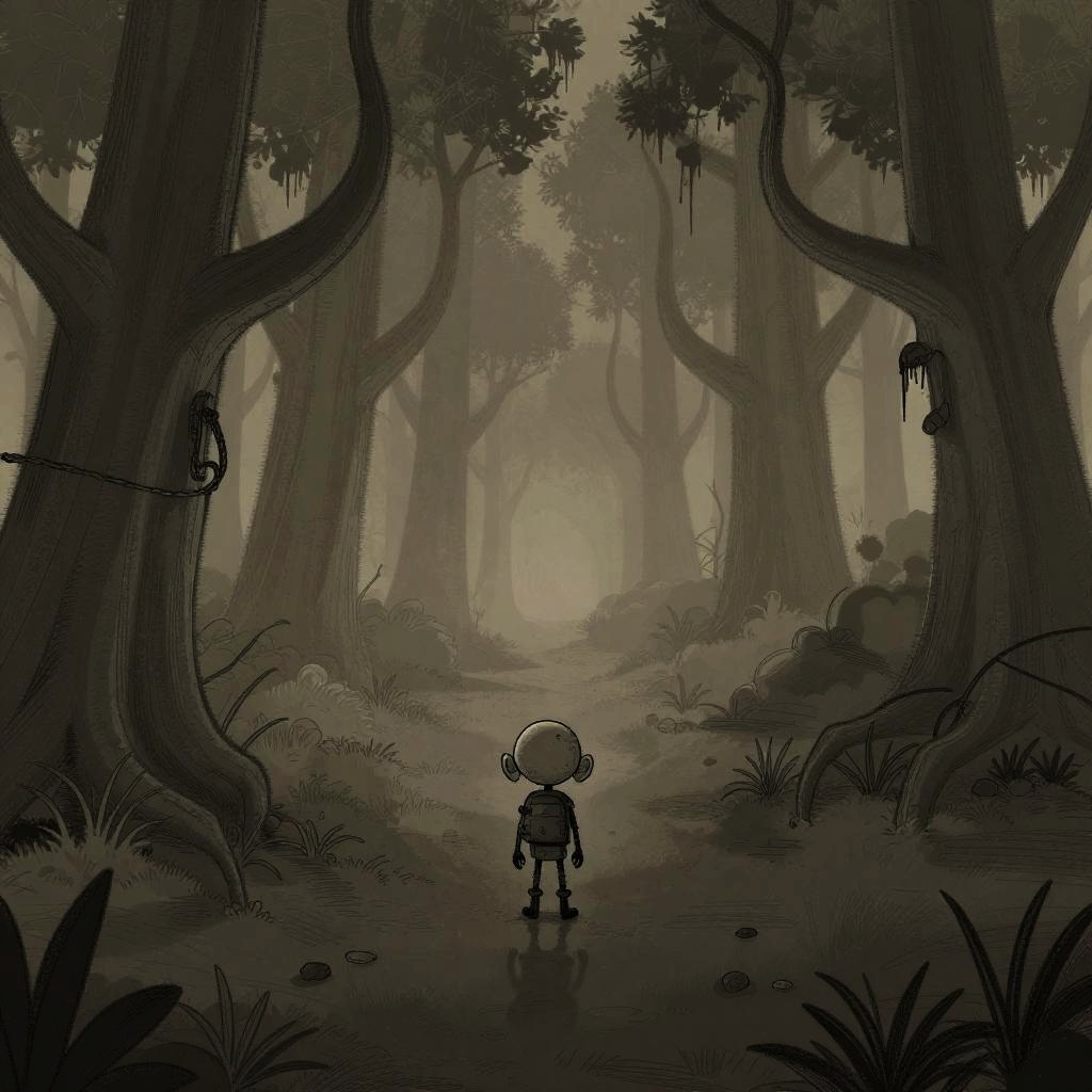 Don't Starve art style, dark whimsical forest scene, twisted trees with eerie shadows, muted earthy tones, hand-drawn sketchy texture, moody atmospheric lighting, surreal survival vibe