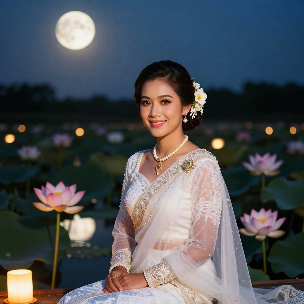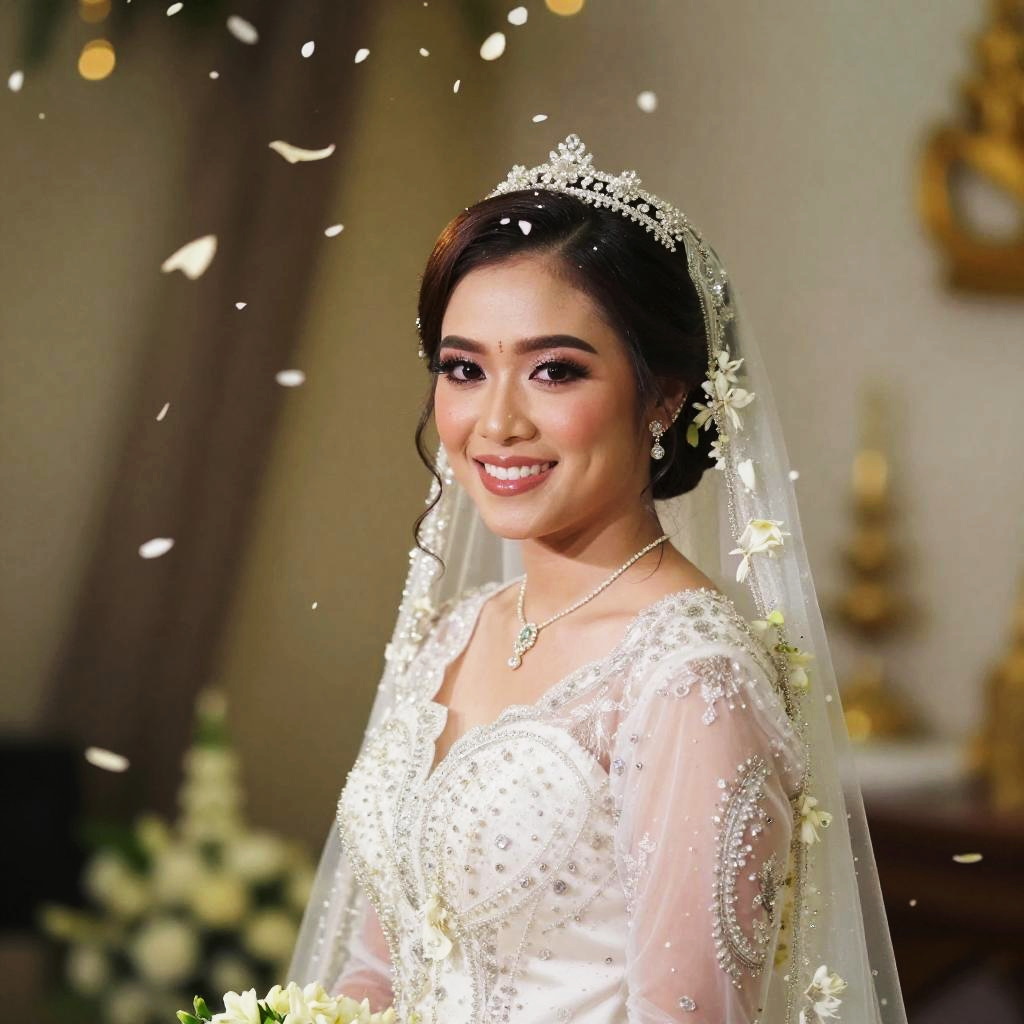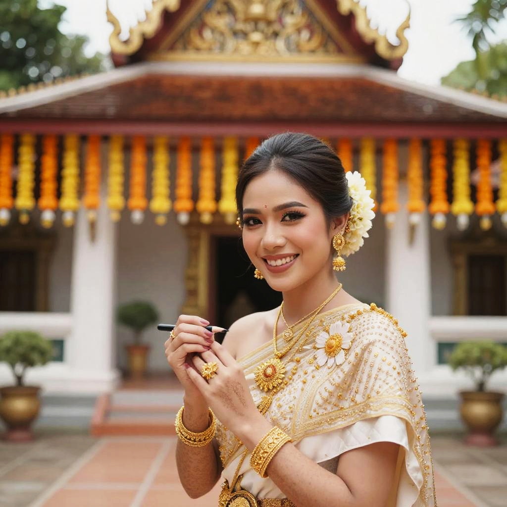 Stenciling a graceful thailand bride on her wedding day, gazing at the camera with pure joy. The backdrop is a colorful garden filled with flowers creating a stunning ambiance that perfectly complements the bride's beauty. With an incredibly wide aperture and a 50mm lens, photo realistic image