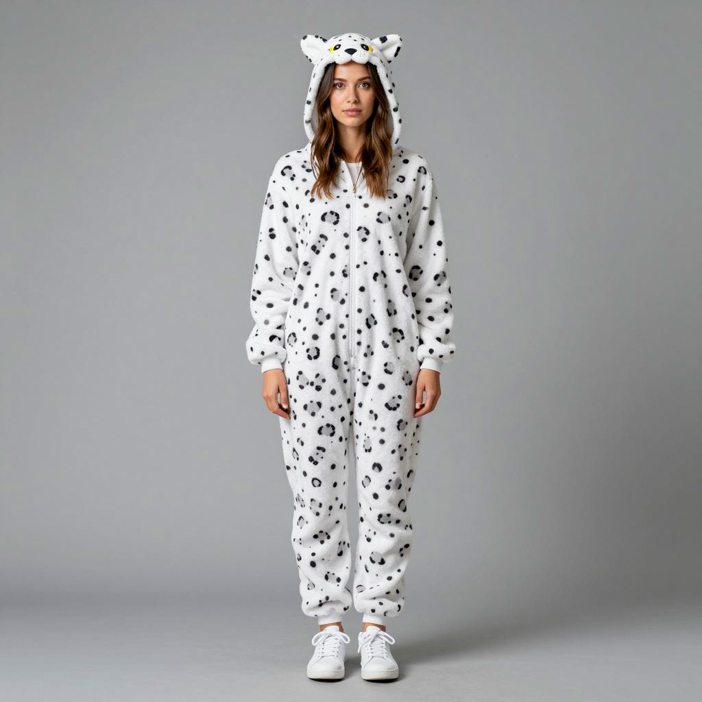White leopard costume, photograph of a woman, standing, full body, wearing a white onesie with black leopard print pattern, hood with cat ears, white long-sleeve shirt underneath, white sneakers, grey background, neutral expression, studio lighting, casual style, realistic ure, soft material, digital photograph, detailed pattern, slight shadow below, centered composition