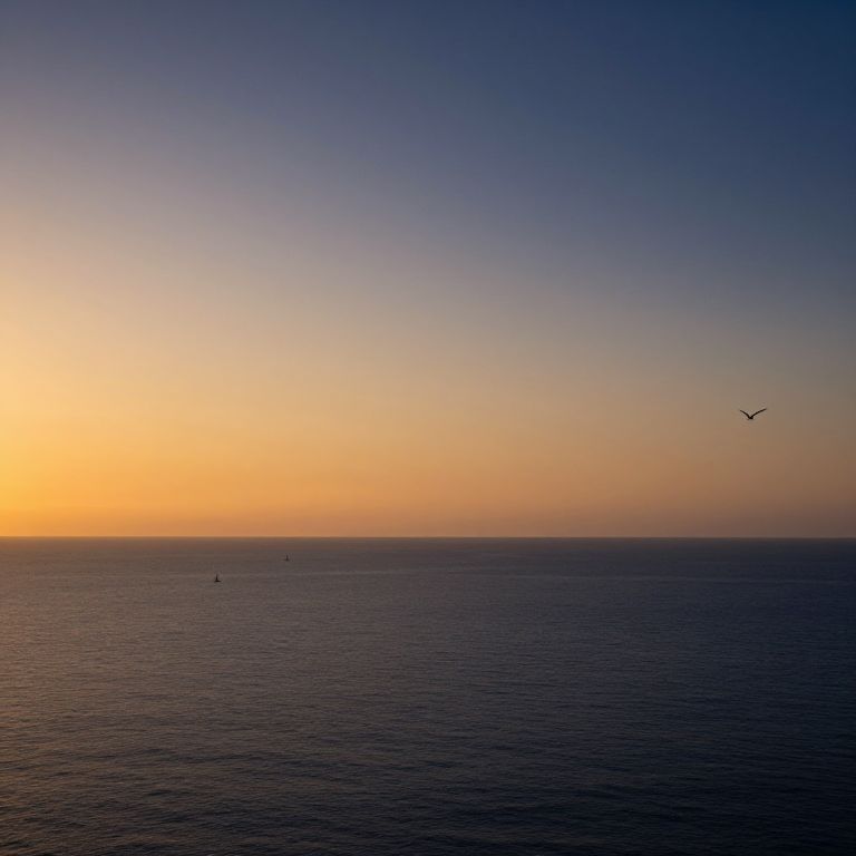 A serene nature landscape featuring a vast, calm ocean under a gradient sky transitioning from golden amber at the horizon to deep indigo above, with distant sailboats and a lone seagull in flight.