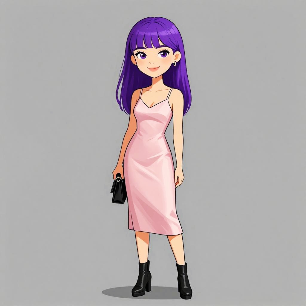 Digital anime-style drawing of a purple-haired girl in a pink, sleeveless, knee-length dress, black ankle boots, and holding a black purse.
