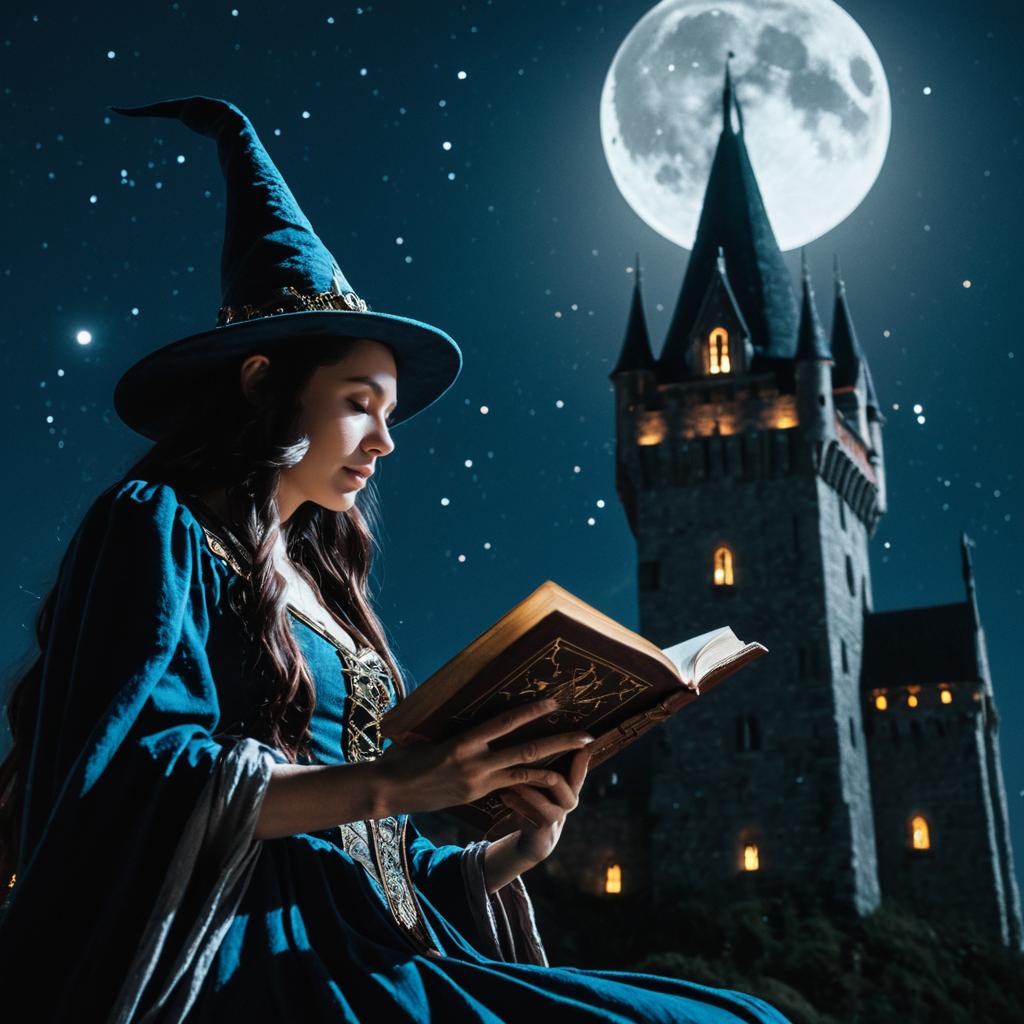 Hyper-realistic cinematic shot of a young woman dressed as a sorceress, wearing a pointed witch hat and elaborate medieval-style blue dress, intently reading an ancient spellbook. She is set against a dramatic night sky filled with stars and a large full moon illuminating a stone castle tower with glowing windows in the background. The atmospheric photo captures detailed textures and moody cinematic lighting.
