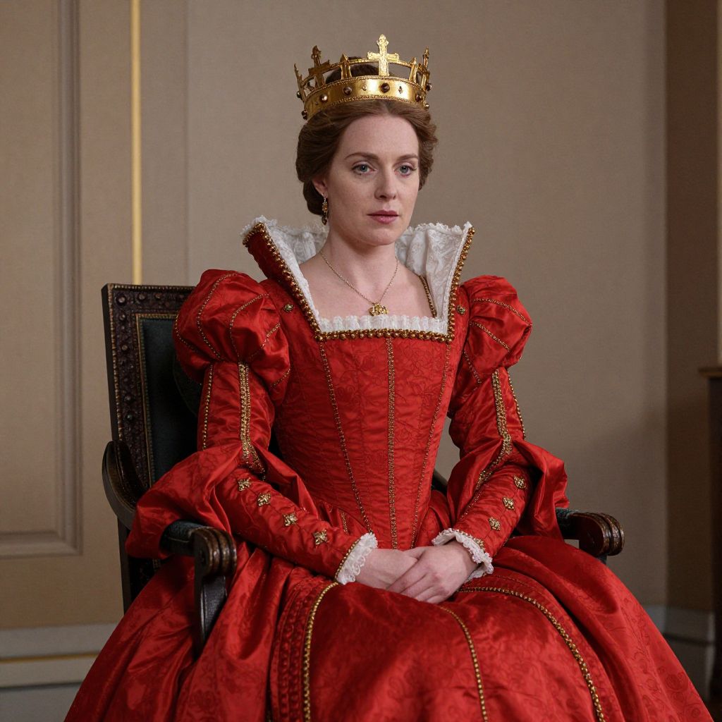 Mary Queen Scots Costume Reign, woman in a red dress and gold crown sitting on a chair
