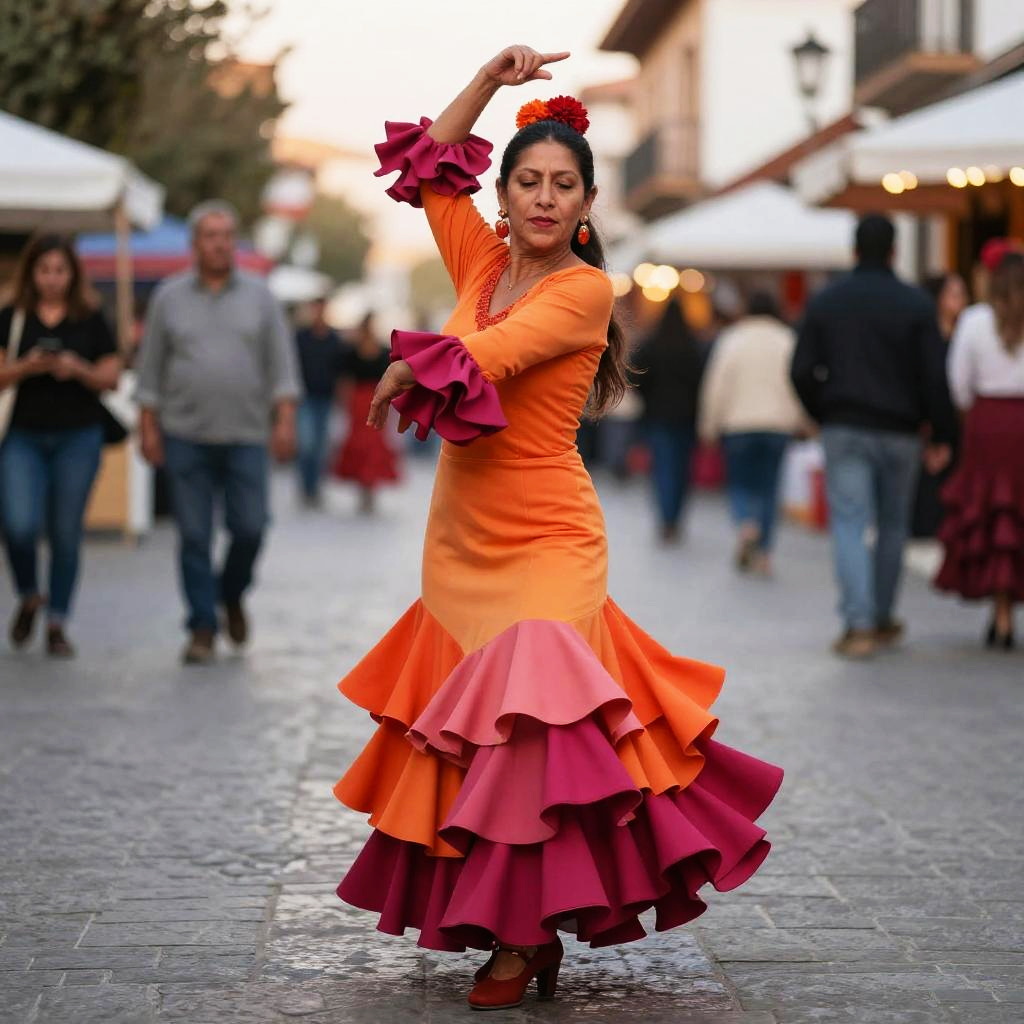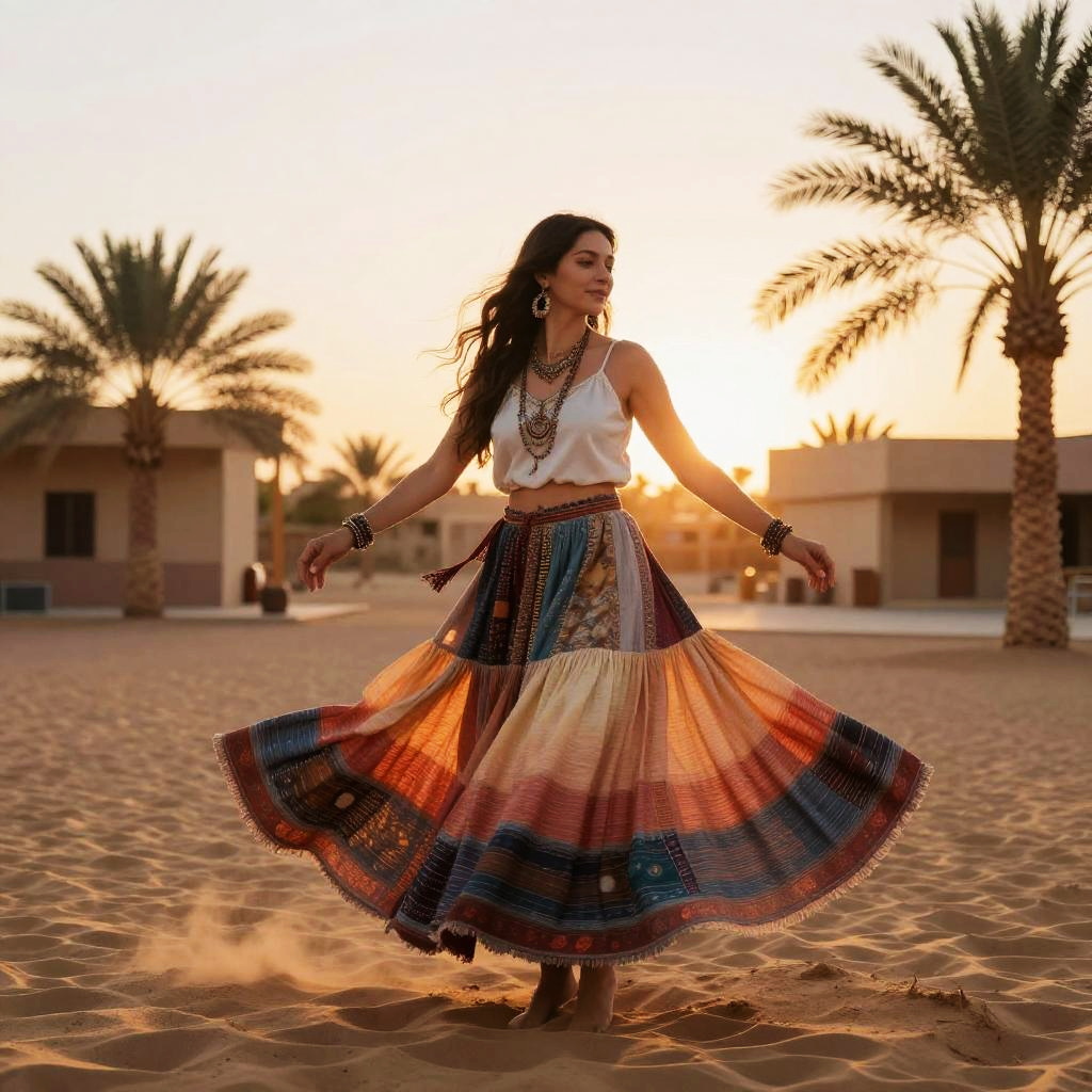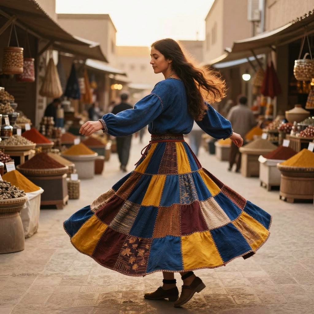 Adventurous traveler wearing bold geometric patterns boho patchwork skirt, twirling in a bustling street market