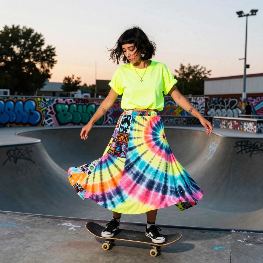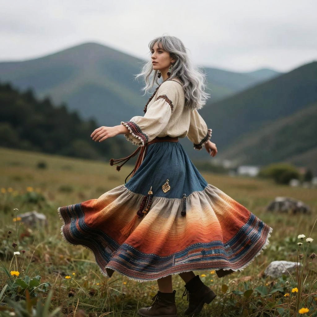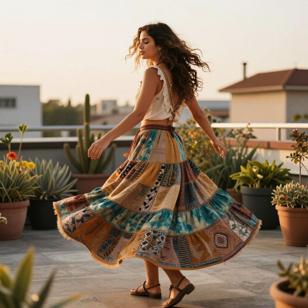 Woman in Boho Patchwork Skirt at Street Market