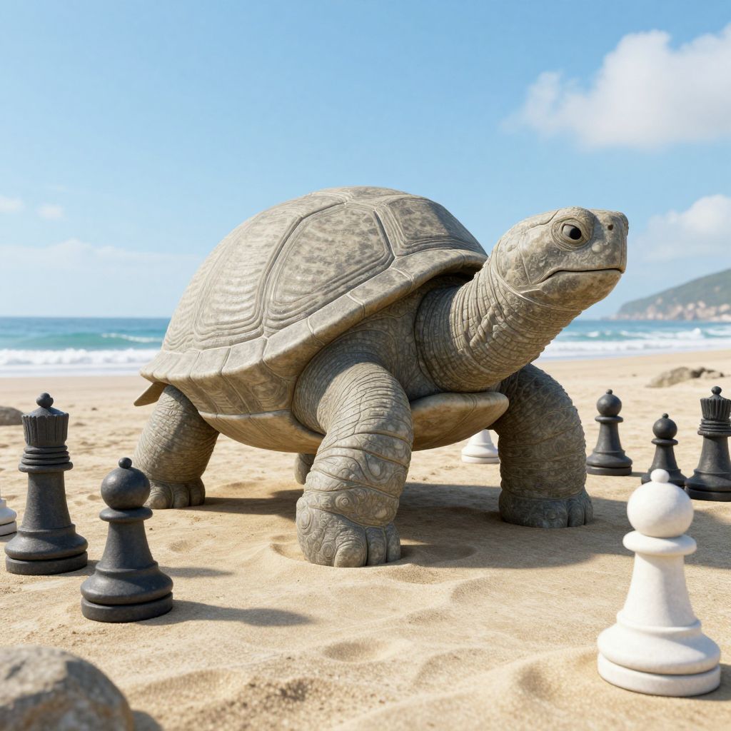 A computer-generated 3D render depicts a colossal stone turtle standing on a sandy beach, surrounded by oversized chess pieces, evoking a surreal and fantastical scene where nature and human invention merge in eternal play.