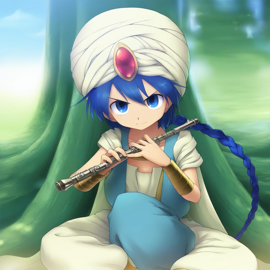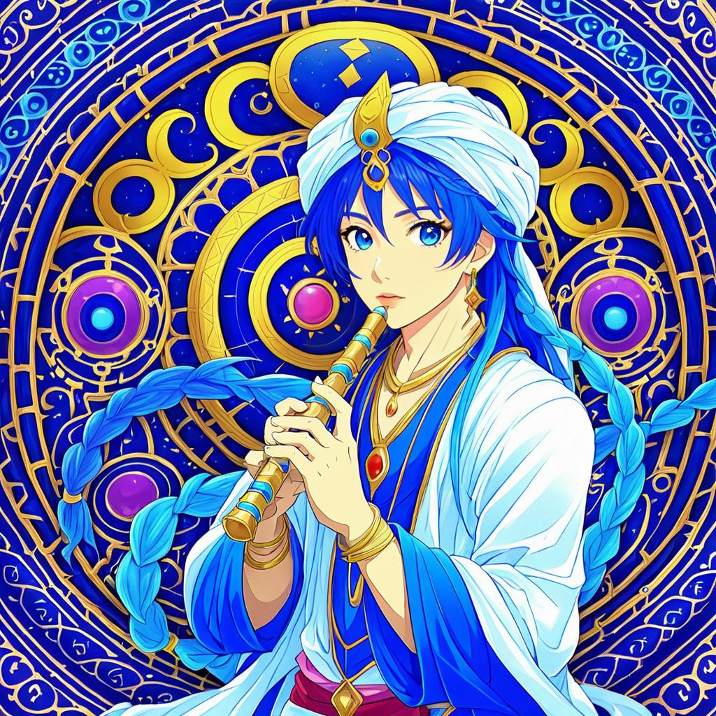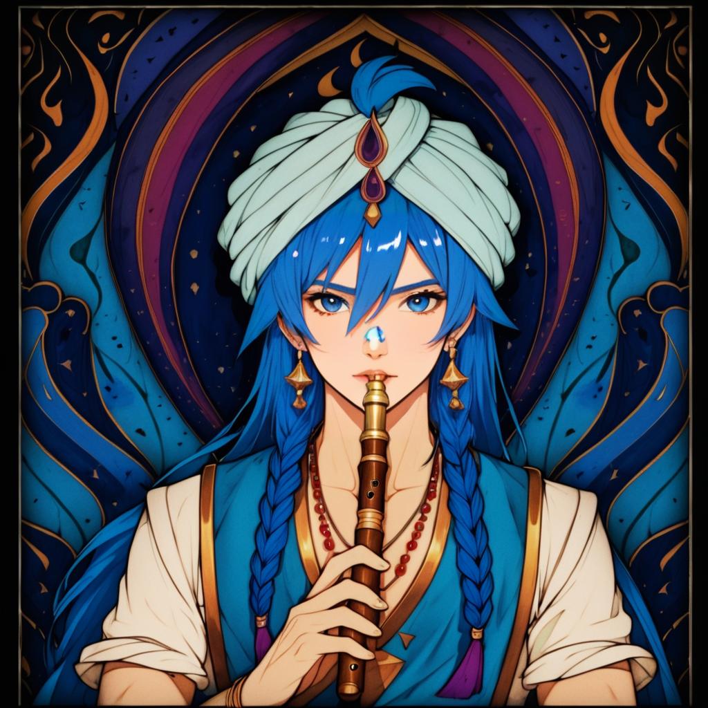 Aladdin (magi), magi the labyrinth of magic, 1boy, blue eyes, blue hair, long hair, single braid, turban, flute, by artist nochita shin, leet